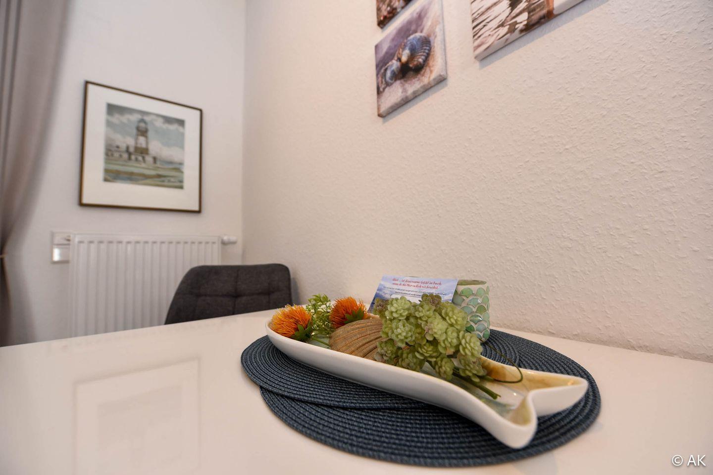 Gemütliches 2-Zimmer-Ferienwohnung im Erdgeschoss des Hauses 4 Muscheln in Cuxhaven-Duhnen. Mit Wohnküche, Doppelbett, WLAN, Parkplatz und bodentiefer Dusche – strandnah und zentral nahe dem Wattenmeer gelegen.
