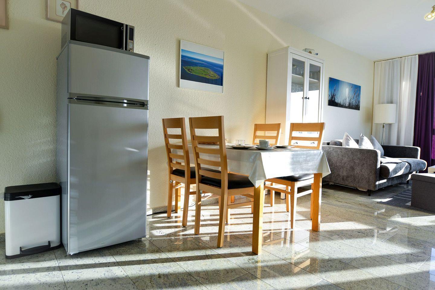 gelegen in der vierten Etage. Die Wohnung bietet ein gemütliches Schlafsofa mit einer Matratze in der Größe 140 x 200 cm und zwei Betten