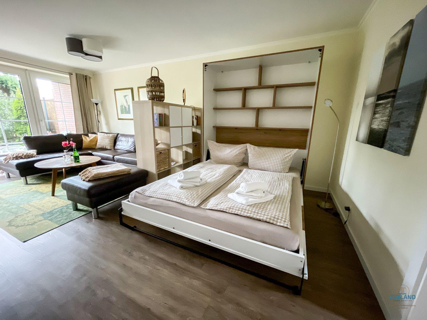 zwei zusätzlichen Schrankklappbetten. Das Schlafzimmer besteht aus einem