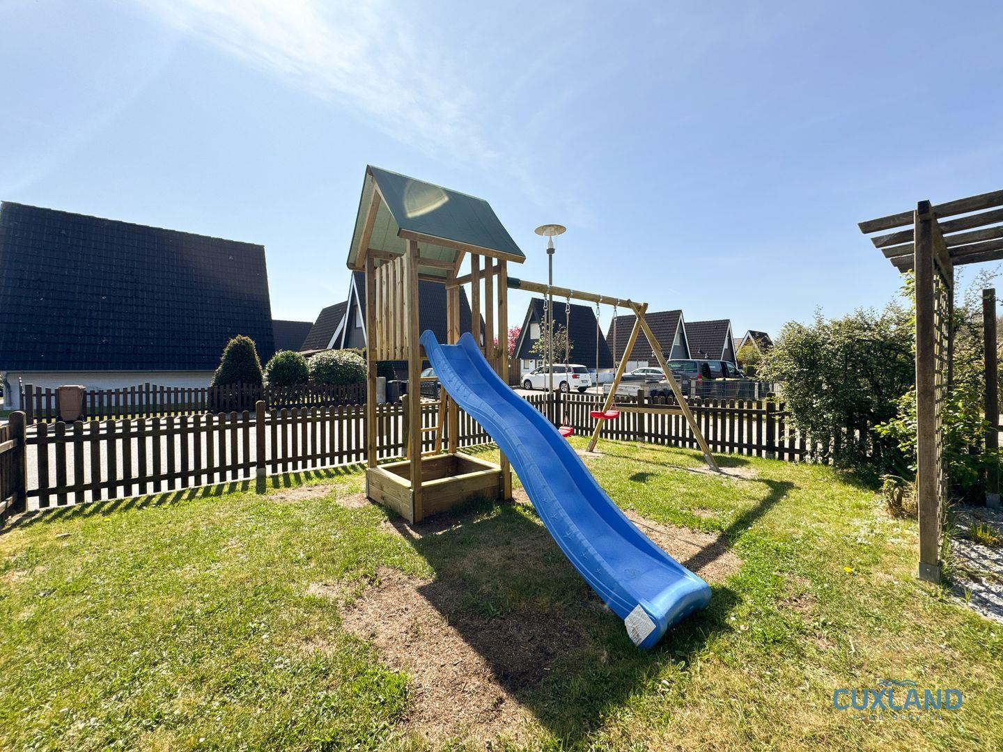 Terrasse grenzt ein eingezäunter Garten mit Schaukel und Sandkasten für die