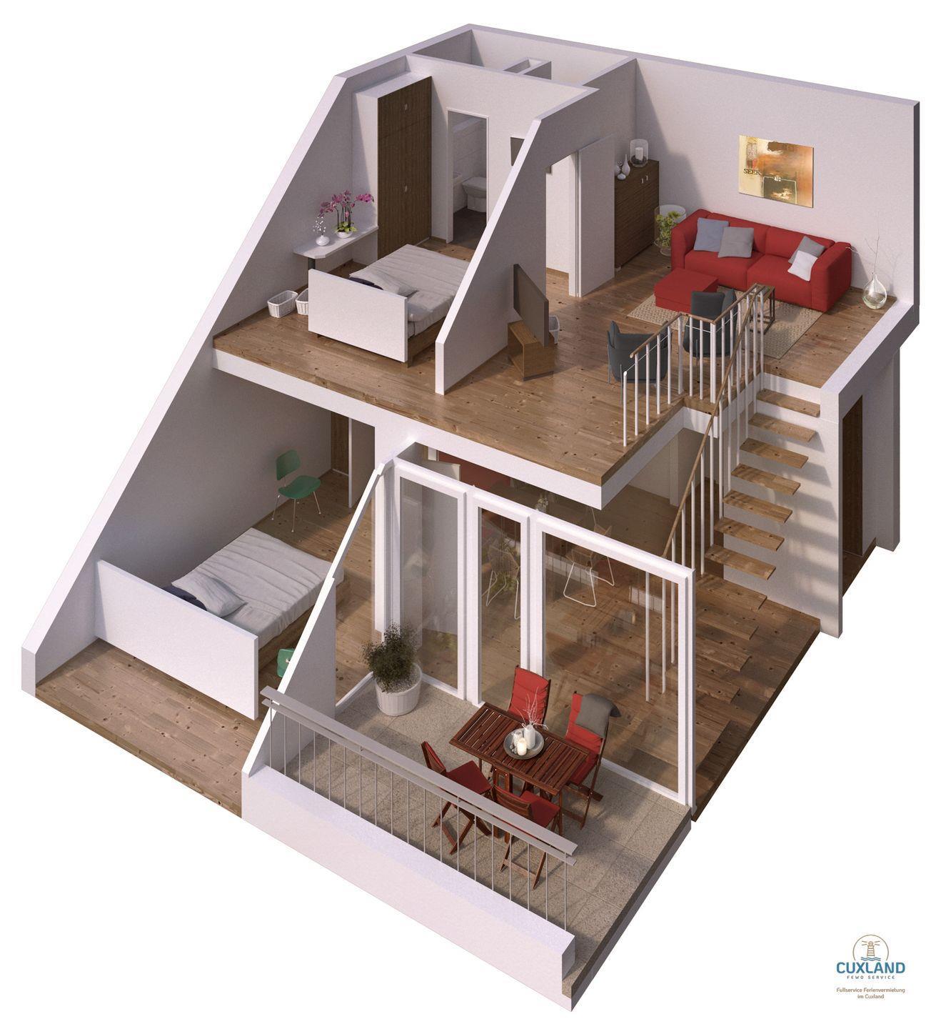 Duhnen befindet. Auf der ersten Ebene besteht die Wohnung aus einer komplett