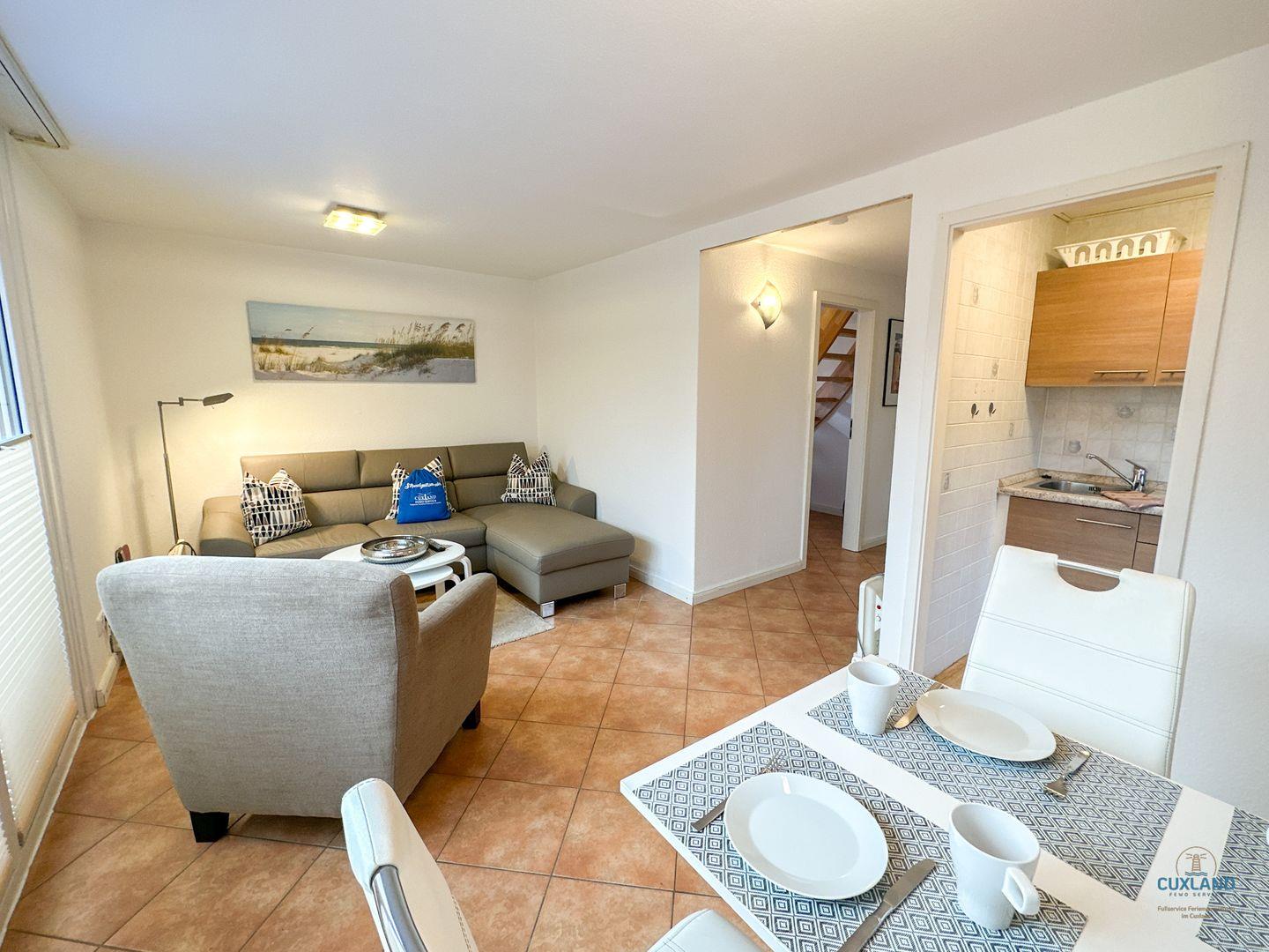 großen Wohnbereich mit Esstisch und gemütlicher Couch. Von hier aus erreicht