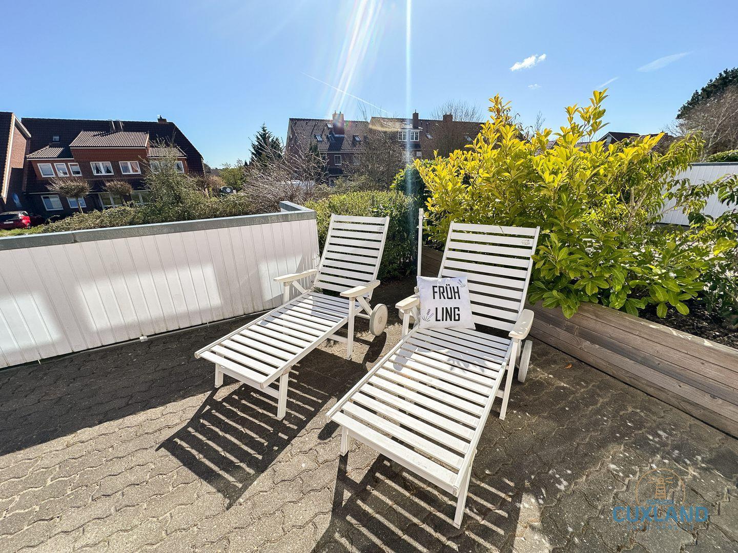 Die große private Sonnenterrasse erreicht Ihr vom Wohnzimmer aus. In der