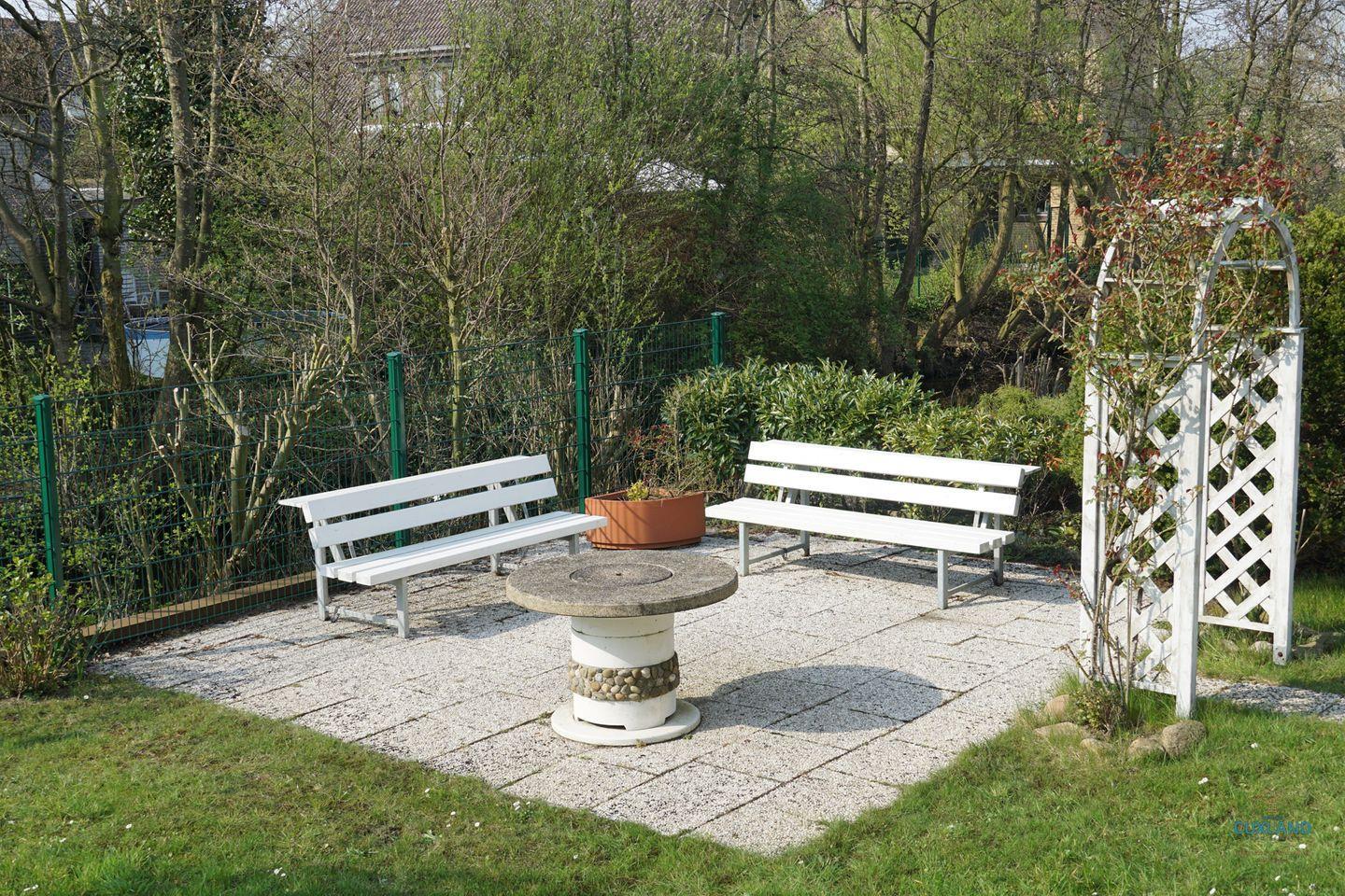 ein kleiner Garten mit Terrasse, der ebenfalls von der Hausgemeinschaft genutzt
