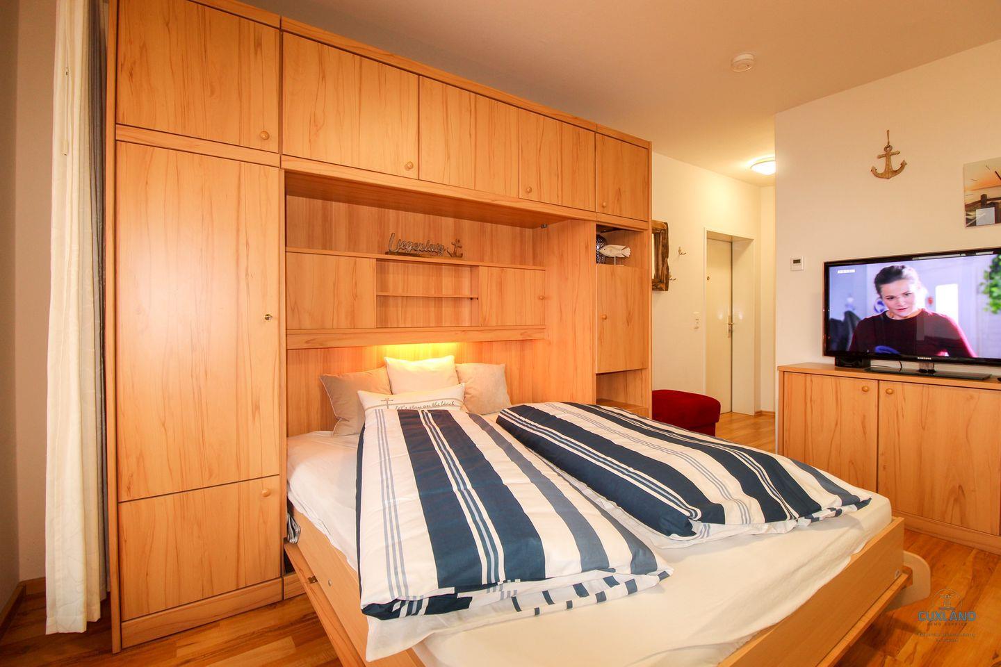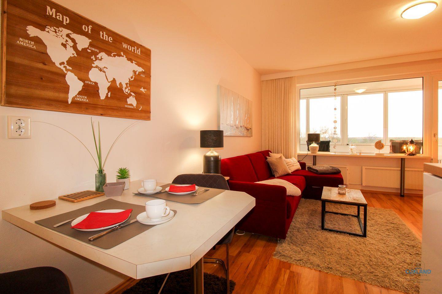 Gemütliches 35qm Apartment im Haus Atlantic, ideal für zwei Personen. Erste Etage mit großem verglasten Balkon für entspannte Stunden. Moderne Kochnische für Snacks und Frühstück. Wohnraum mit gemütlichem Sofa und Schrankklappbett. Kostenfreies WLAN und eigener PKW-Stellplatz vorhanden.