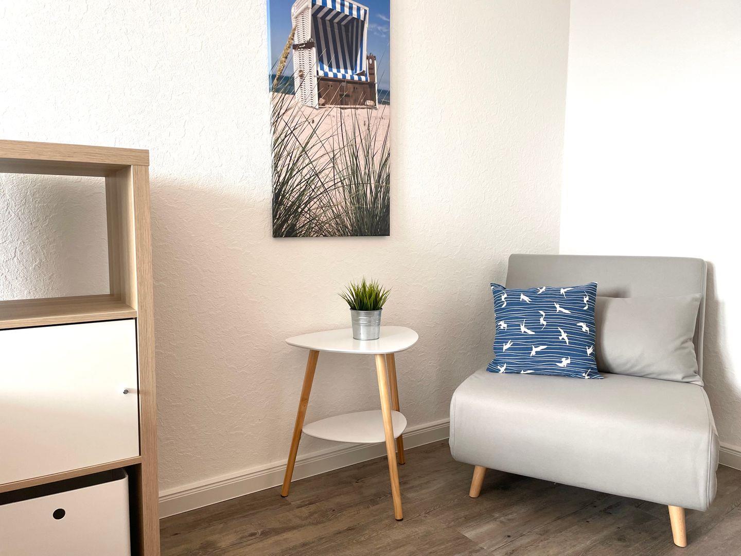 Der helle, großzügige Wohnraum bietet Essecke und Sitzgruppe, die kleine, gut ausgestattete Küche ist separat. Zum Relaxen und Seele baumeln lassen lädt der Balkon ein. Genießen Sie dort die Seeluft - je nach Wetterlage bei geöffneter oder geschlossener Verglasung.
