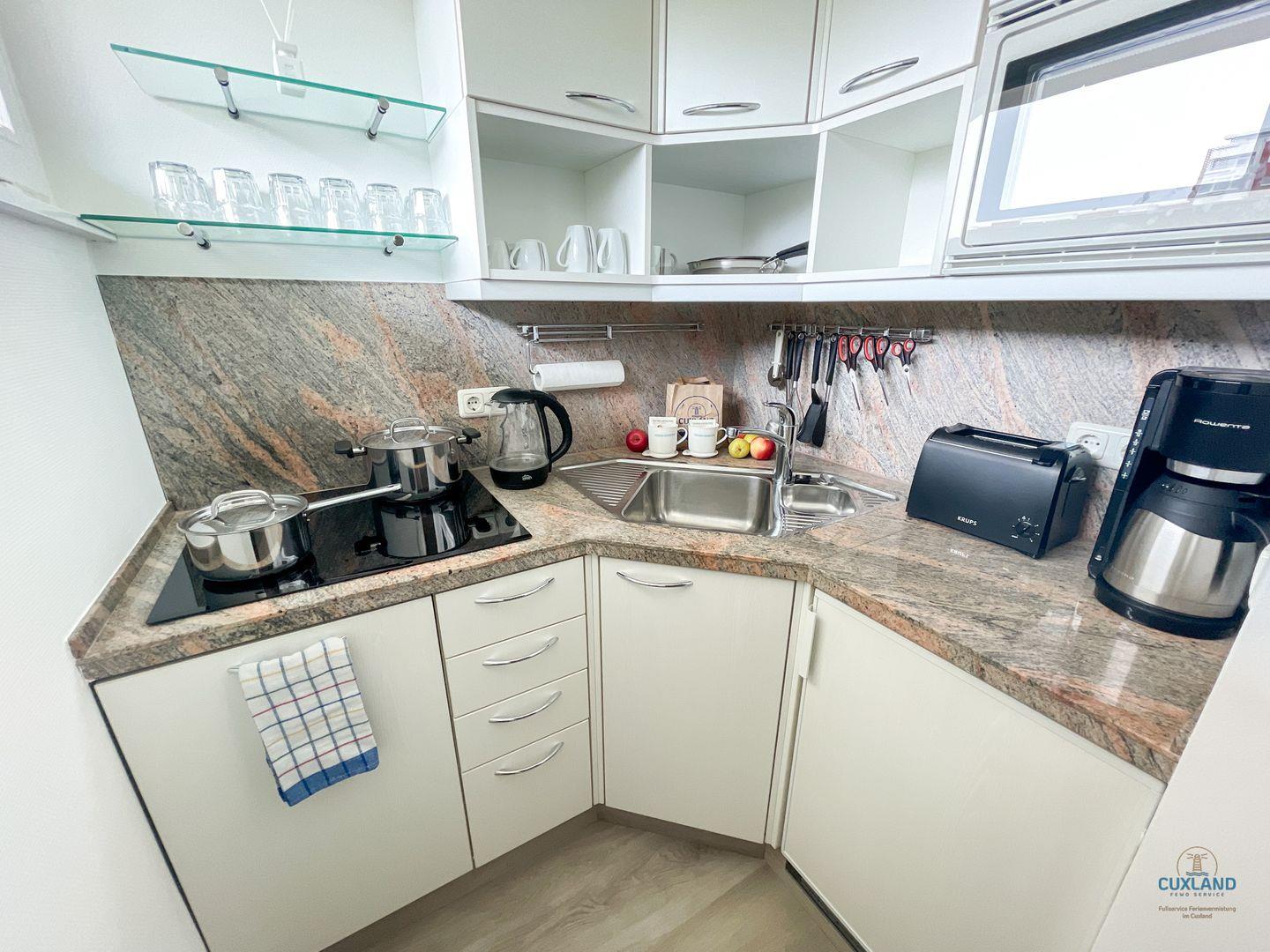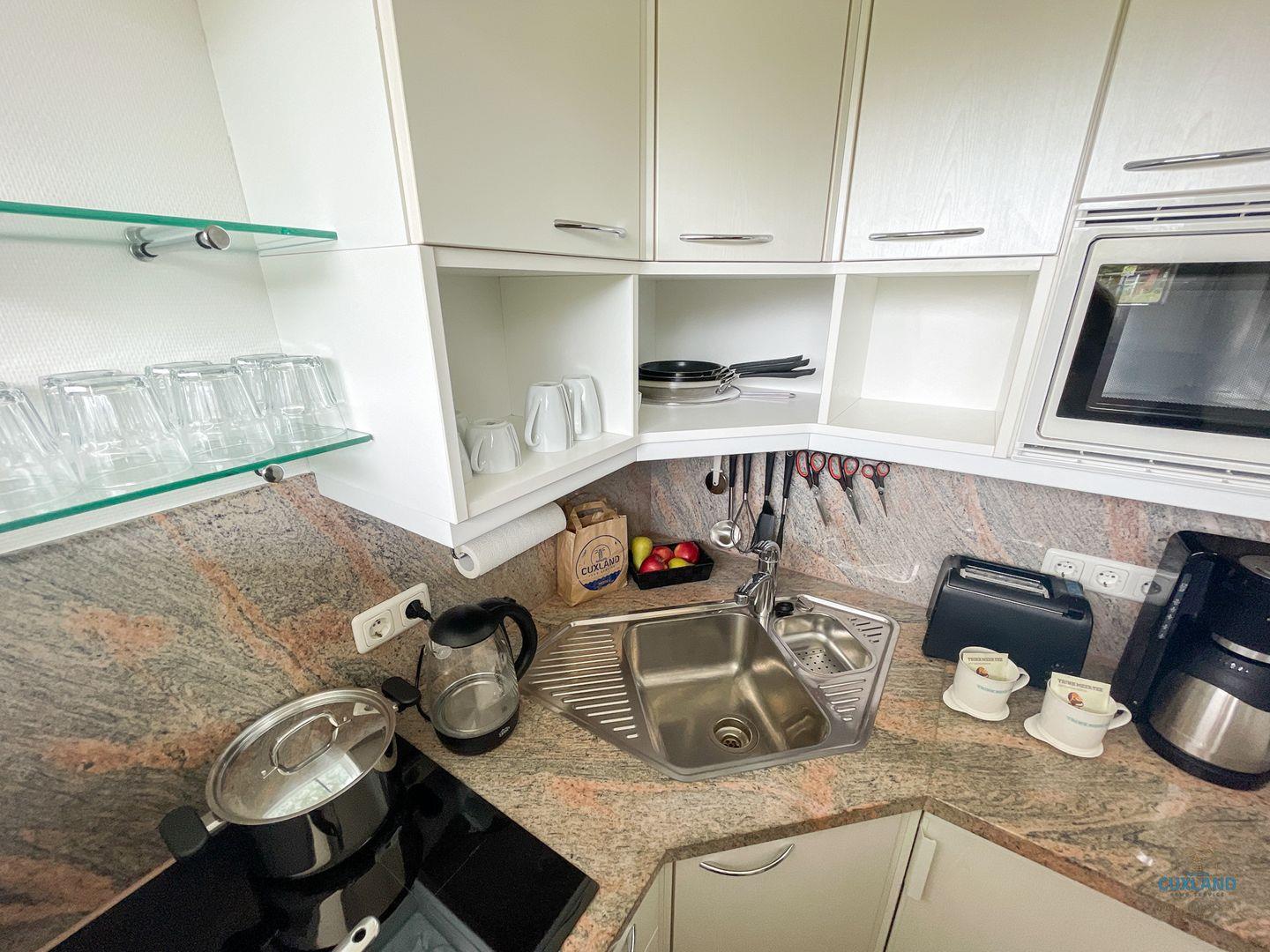 Die Küche bietet dir alle Annehmlichkeiten, um köstliche Mahlzeiten zuzubereiten. Du findest hier einen Cerankochfeldherd, eine Spülmaschine, eine Mikrowelle sowie eine Kaffeemaschine, einen Wasserkocher und einen Toaster. Das umfangreiche Kücheninventar umfasst Geschirr, Besteck und Küchenutensilien, die dir das Kochen leicht machen.