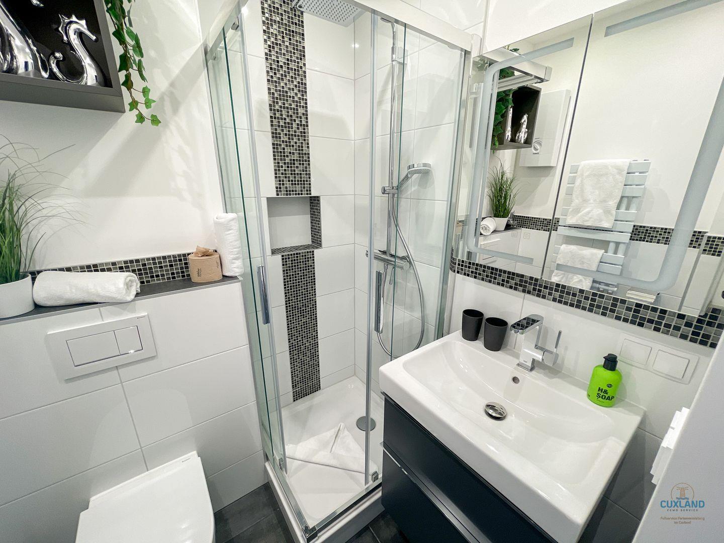 Das Badezimmer ist modern ausgestattet und verfügt über eine Dusche sowie alle notwendigen Sanitäranlagen, einschließlich Waschbecken, WC und Haartrockner.