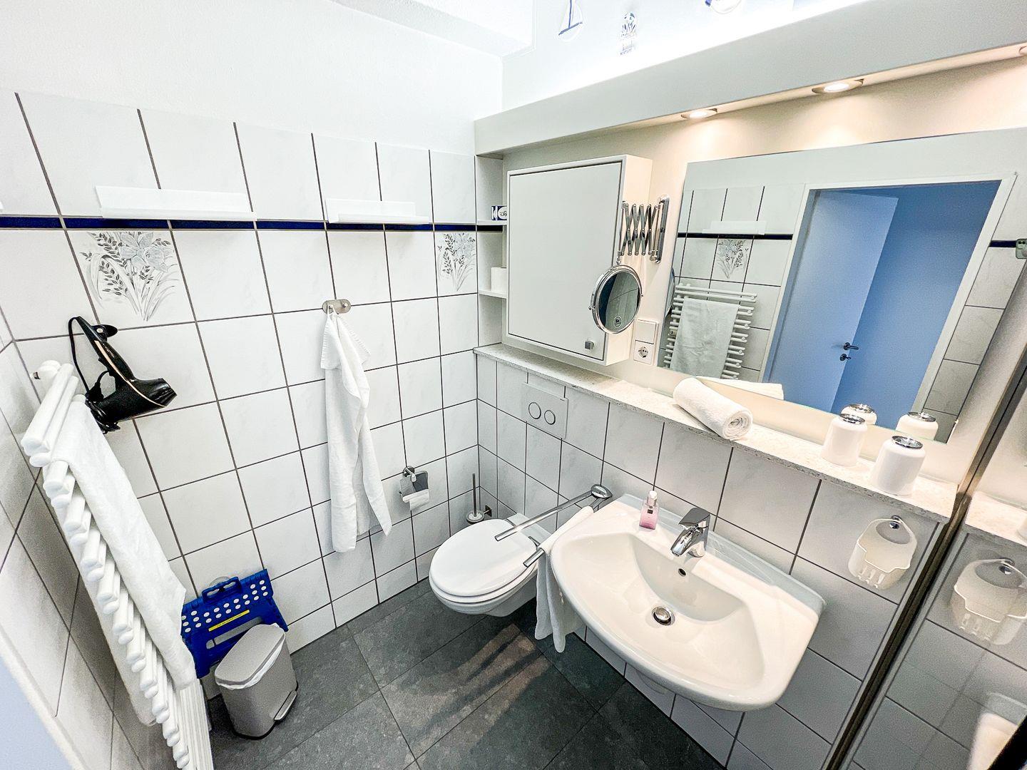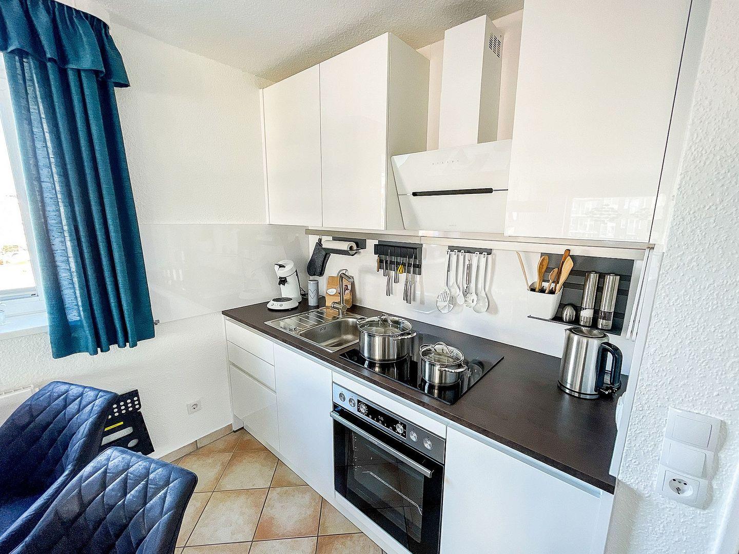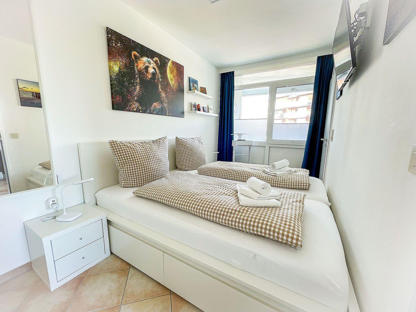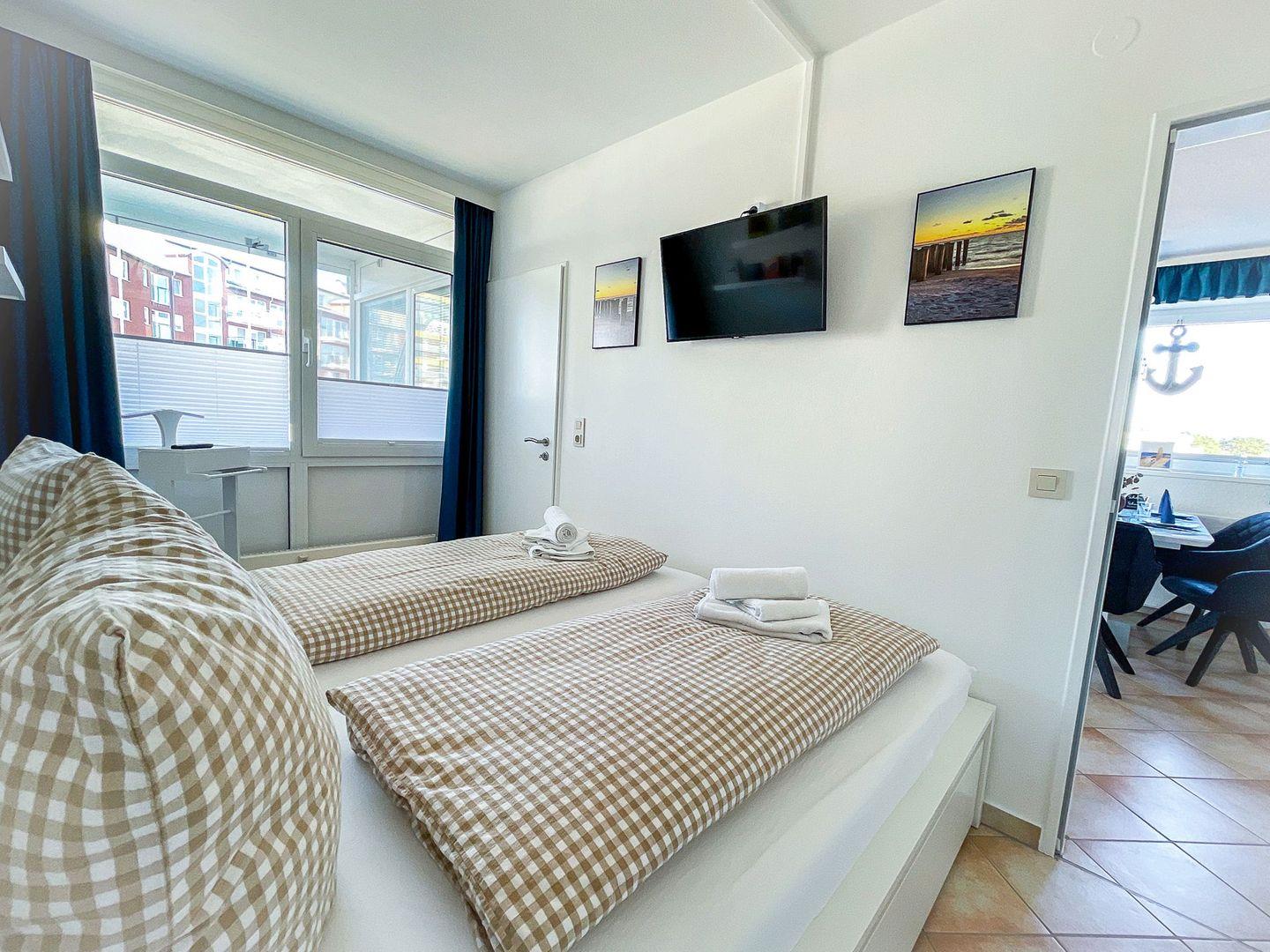 Nordweh 0412 – gemütliche Ferienwohnung im Haus Frische Brise in der 4. Etage mit Meerblick, 2 Schlafzimmern, WLAN, 3 TVs, Schwimmbad, Sauna (Gebühr), Hund erlaubt, Strandkorb inklusive. Nur 150?m bis zum Strand.