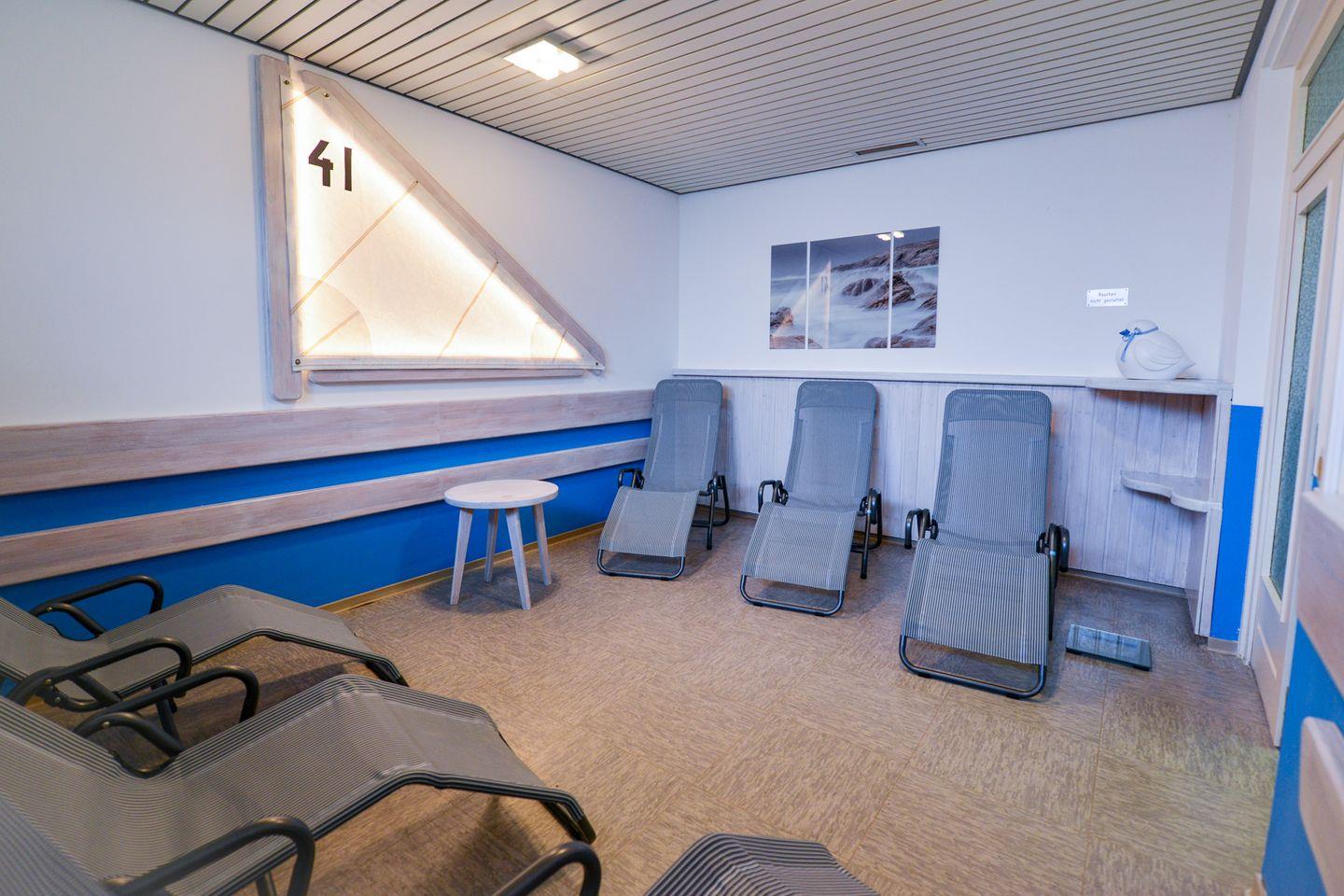 Genießen Sie die frische Nordseeluft auf dem überdachten Balkon und erholen Sie sich im Wellness- und Erholungsbereich der Anlage, der sich im Untergeschoss befindet. Dort stehen Ihnen ein Schwimmbad, eine Sauna und ein Dampfbad zur Verfügung (Sauna und Dampfbad gegen Gebühr).