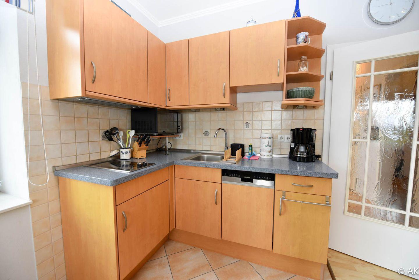 Die Küchenzeile ist praktisch in den Wohnbereich integriert und mit allem ausgestattet, was Sie für die Zubereitung Ihrer Mahlzeiten benötigen. Ein Geschirrspüler sorgt dafür, dass Sie Ihren Urlaub in vollen Zügen genießen können, ohne sich um den Abwasch zu kümmern.