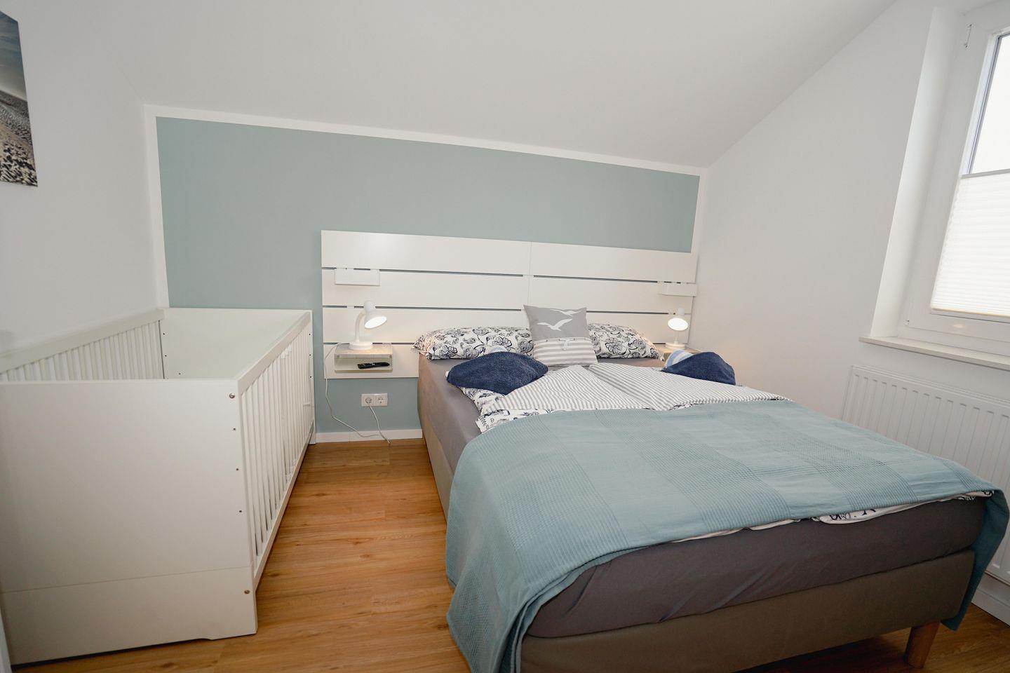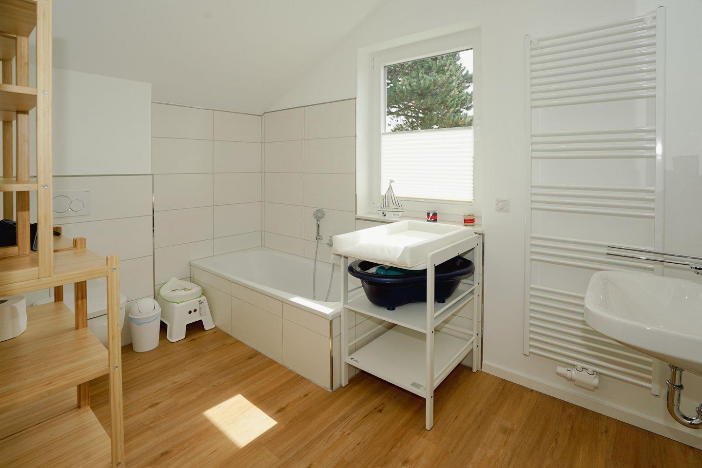 Bad mit Badewanne und Wickeltisch. Die drei Schlafzimmer mit gemütlichen Betten, teilen sich wie folgt auf: ein Schlafzimmer mit großem Doppelbett (180x200) und TV, ein Schlafzimmer mit Doppelbett, TV und Babybett (Gitterbett) und ein Kinderschlafzimmer mit Etagenbett und einem modernen Bodenbett (Hausbett).
