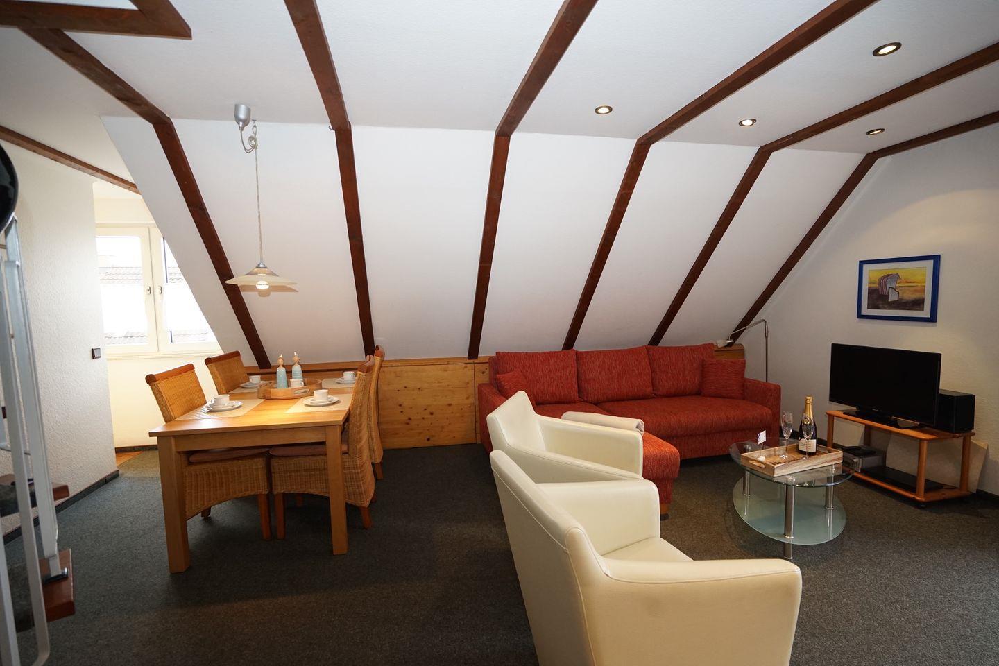 Großzügiger, heller Wohnbereich mit gemütlichem Sofa und Sesseln, Flachbild-TV und einem großen Esstisch mit Stühlen.