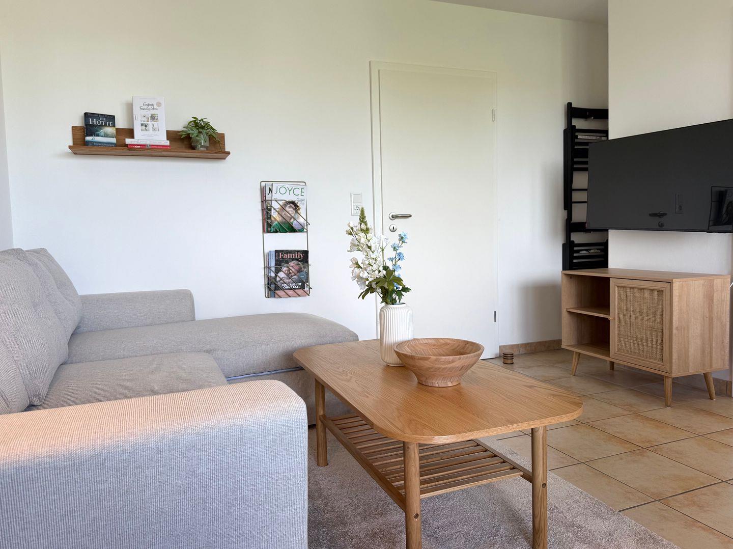 Das Wohnzimmer ist mit einem gemütlichen Schlafsofa ausgestattet, sodass Sie nach einem langen Tag am Strand entspannen und die Zeit mit Ihren Liebsten genießen können. Ein Fernseher sorgt für Unterhaltung an regnerischen Tagen. Von Ihrem überdachten Balkon aus haben Sie einen herrlichen Blick auf die Umgebung, ideal für einen Kaffee am Morgen oder ein Glas Wein am Abend.