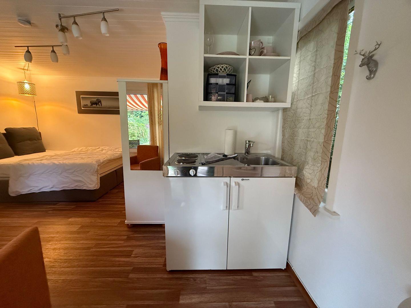Mit einer Wohnfläche von ca. 18 m² ist die Datscha klein, aber fein – perfekt für alle, die ein bisschen Abstand vom Alltag suchen und Wert auf Privatsphäre legen. Der Wohnraum ist funktional und liebevoll eingerichtet und bietet alles, was man für eine erholsame Zeit braucht: eine praktische Kochnische mit 2-Platten-Herd, Kühlschrank und Kaffeemaschine sowie einen Essbereich für gemütliche Mahlzeiten.