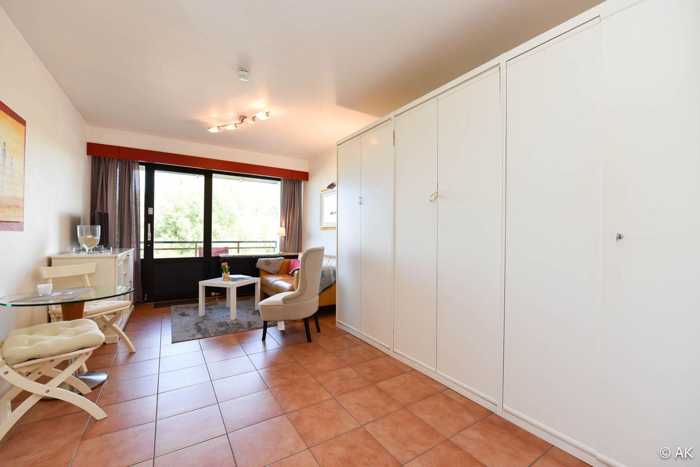 Ideal für zwei Personen ausgestattet, erwartet Sie ein praktisches Schrankbett, das tagsüber für mehr Platz sorgt, sowie ein gemütliches Sofa mit Tisch. Die separate Kochnische erlaubt die Zubereitung kleiner Mahlzeiten – ideal für ein Frühstück auf dem Balkon oder einen Snack zwischendurch. Das moderne Duschbad mit WC rundet den Wohnkomfort ab.