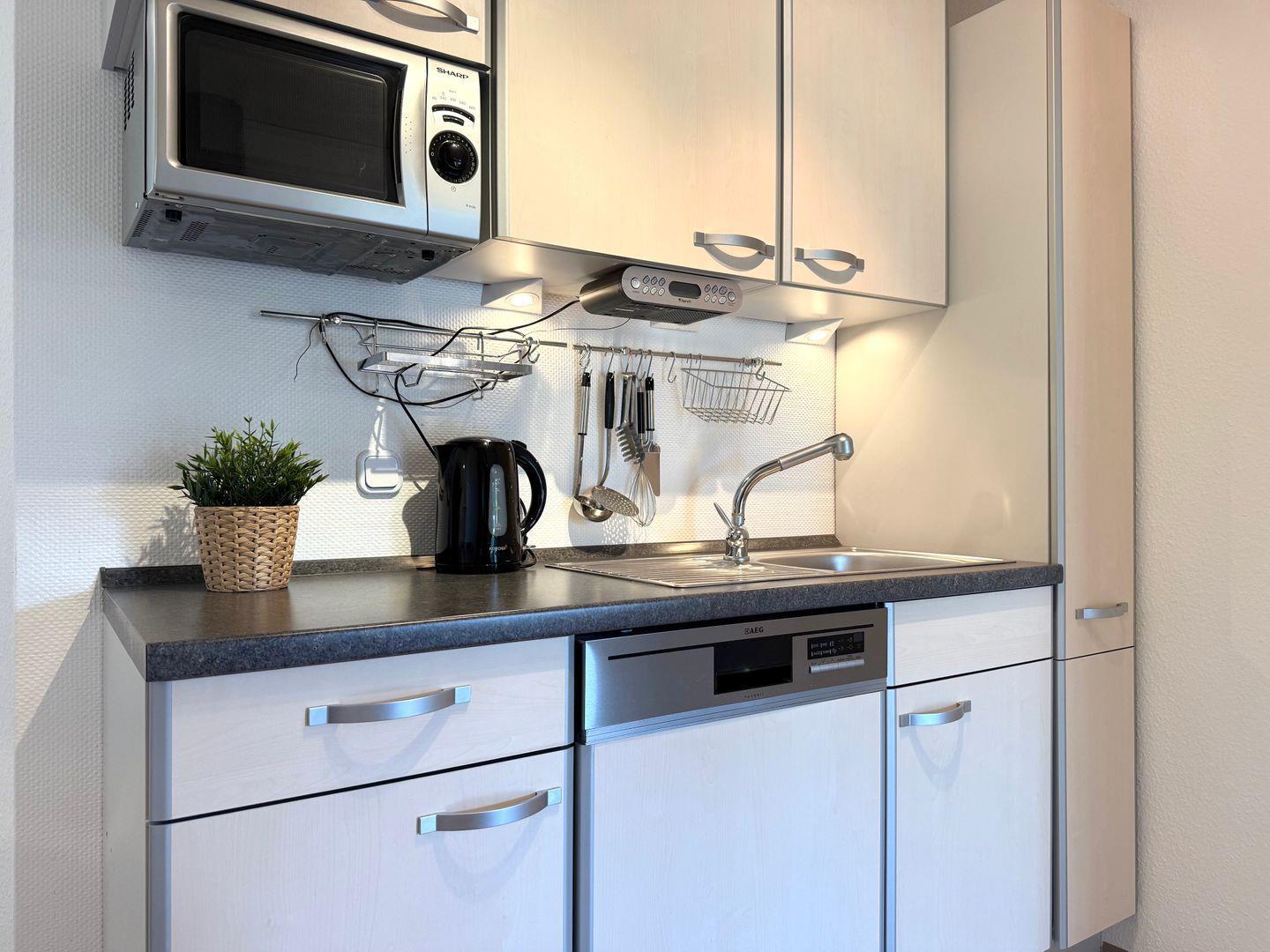 Die Küche der Wohnung ist vollständig eingerichtet: Zur Ausstattung gehören ein Herd, Backofen, Mikrowelle, Kühlschrank, Kaffeemaschine, Wasserkocher, Toaster sowie Geschirr und Besteck. Umfangreiche Küchengeräte ermöglichen es Ihnen, auch im Urlaub flexibel und komfortabel zu kochen. Durch die Eigennutzung einer Waschmaschine gestalten Sie Ihren Aufenthalt auch für längere Zeiträume unabhängig und praktisch.