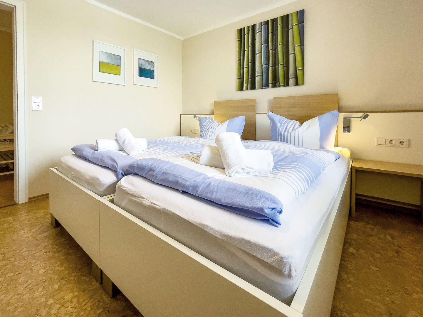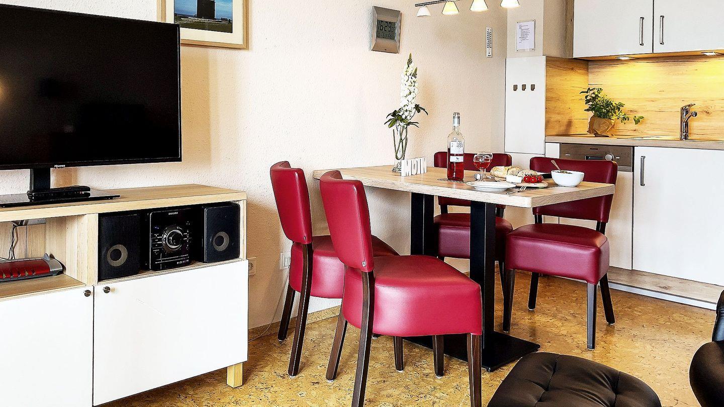 Zur Ausstattung gehören ein eigener Parkplatz am Haus (Nr. 21), ein Fahrradraum mit E-Bike-Ladestation sowie eine Sauna mit Ruheraum (gegen Gebühr). Die Unterkunft ist haustierfrei und besonders für Allergiker geeignet Ein Aufzug ist vorhanden; bitte beachten Sie, dass je nach Lage der Wohnung auf der Etage einige wenige Stufen zu Fuß zurückzulegen sind.