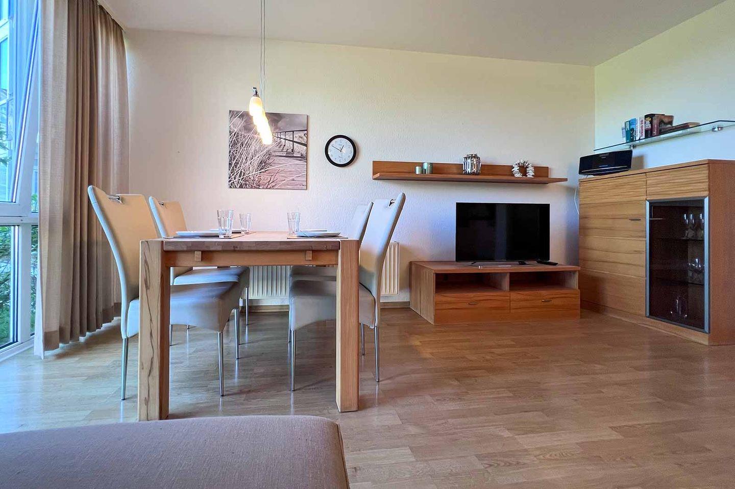 Die Einrichtung umfasst ein großzügiges Schlafzimmer und ein gemütliches Wohnzimmer, in dem eine Sofaecke zum Verweilen einlädt. Hier können Sie entspannte Abende mit einem guten Film auf dem großen Fernseher verbringen, der mit einem digitalen Kabelanschluss verbunden ist. Für Ihre Lieblingsmusik stehen ein CD-Spieler und ein Radio bereit. Die Wohnung ist als Nichtraucherunterkunft konzipiert, was zu einem angenehmen und frischen Raumklima beiträgt.