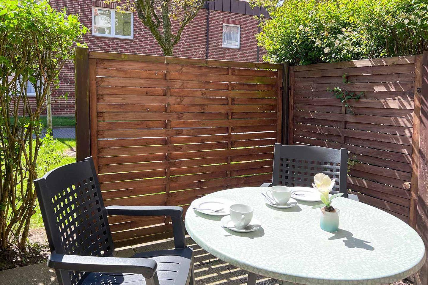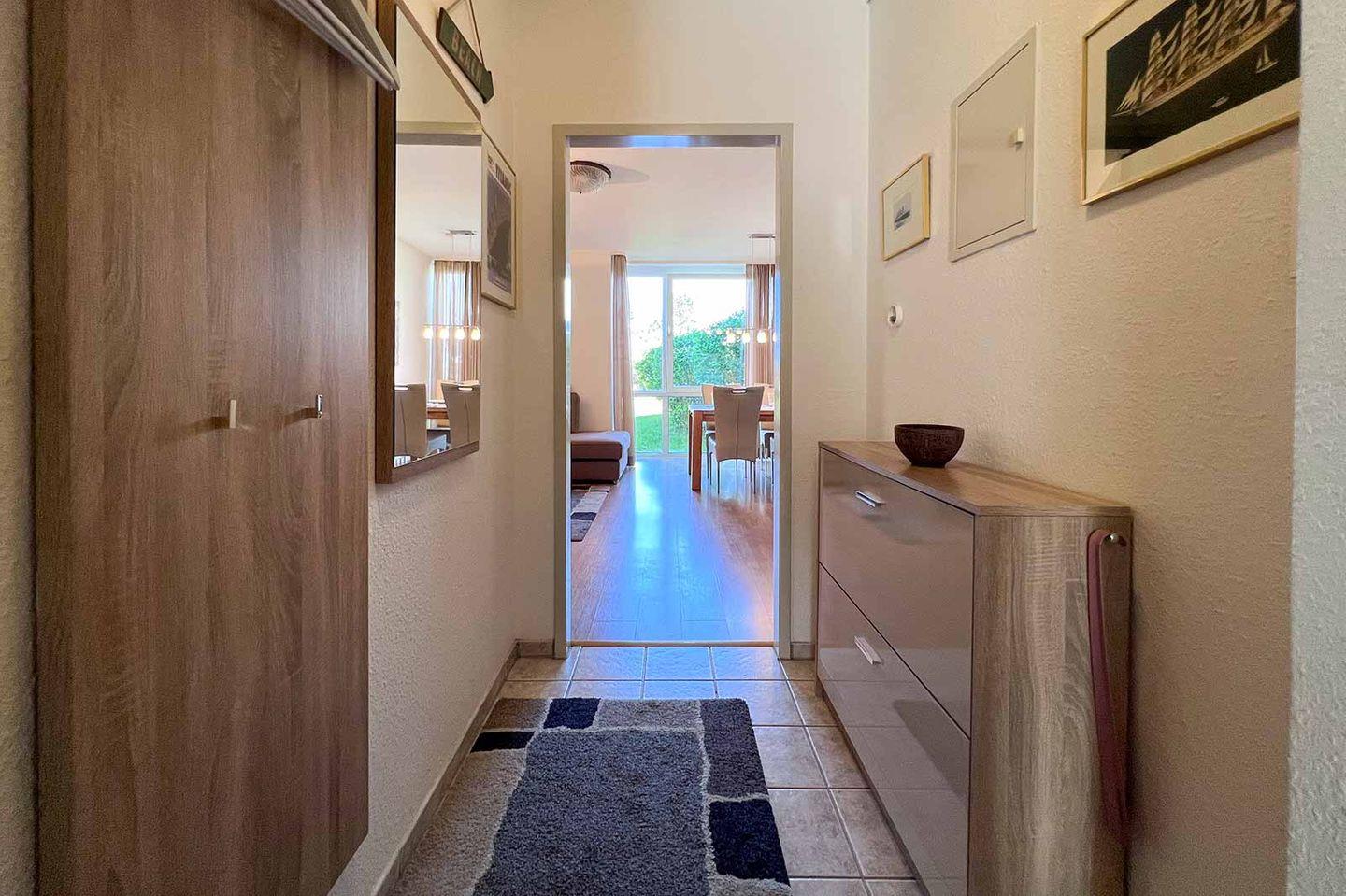 Die Wohnung bietet auch einen direkten Zugang zu einer Terrasse, auf der Sie die frische Meeresluft genießen können. Gartenmöbel laden dazu ein, die Sonnenstrahlen in angenehmer Umgebung zu erleben. Für Gäste, die mit dem Auto anreisen, steht ein Privatparkplatz in der Tiefgarage zur Verfügung.