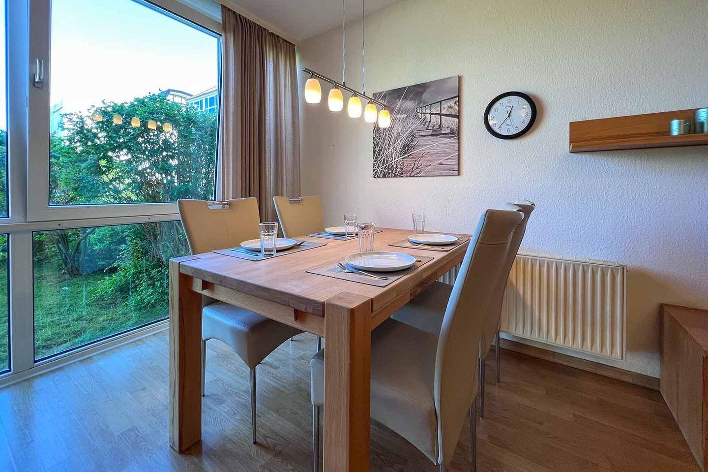 Die Residenz Passat Ferienwohnung 9 bietet auf 46 m² eine komfortable Unterkunft im Parterre, nur 150 m vom Sandstrand entfernt. Zur Ausstattung zählen eine offene Küche mit Spülmaschine, ein Wohnzimmer mit Kabel-TV, Schlafzimmer mit Laminatboden, Terrasse mit Gartenmöbeln, WLAN, ein beheizter Indoor-Pool sowie Sauna und privater Parkplatz. Kinder sind willkommen.