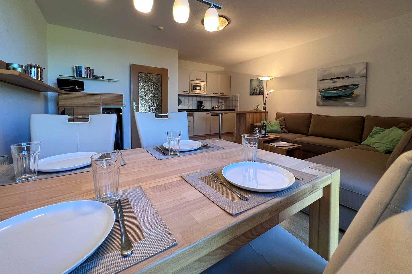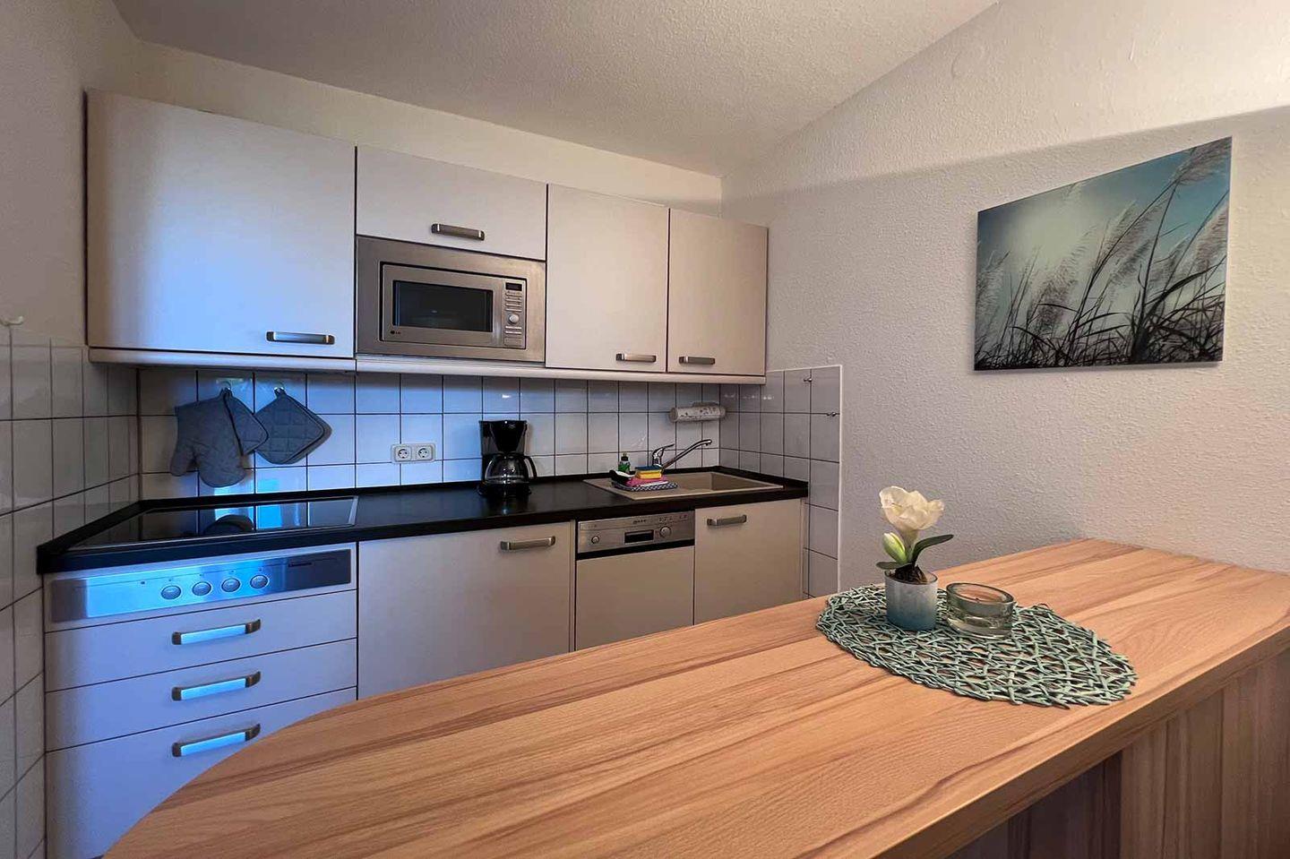 Die offene Küche fügt sich nahtlos in den Wohnbereich ein und ist mit sämtlichen Annehmlichkeiten ausgestattet, die für einen komfortablen Aufenthalt nötig sind. Dazu gehören unter anderem ein Herd mit Ceranfeld, ein Kühlschrank mit Gefrierfach, eine Mikrowelle, ein Toaster sowie eine Kaffeemaschine. Auch Geschirr und Besteck sind in umfassendem Maße vorhanden, sodass Sie Ihre kulinarischen Vorlieben nach Herzenslust umsetzen können. Eine Spülmaschine erleichtert Ihnen die Reinigung nach dem Essen.