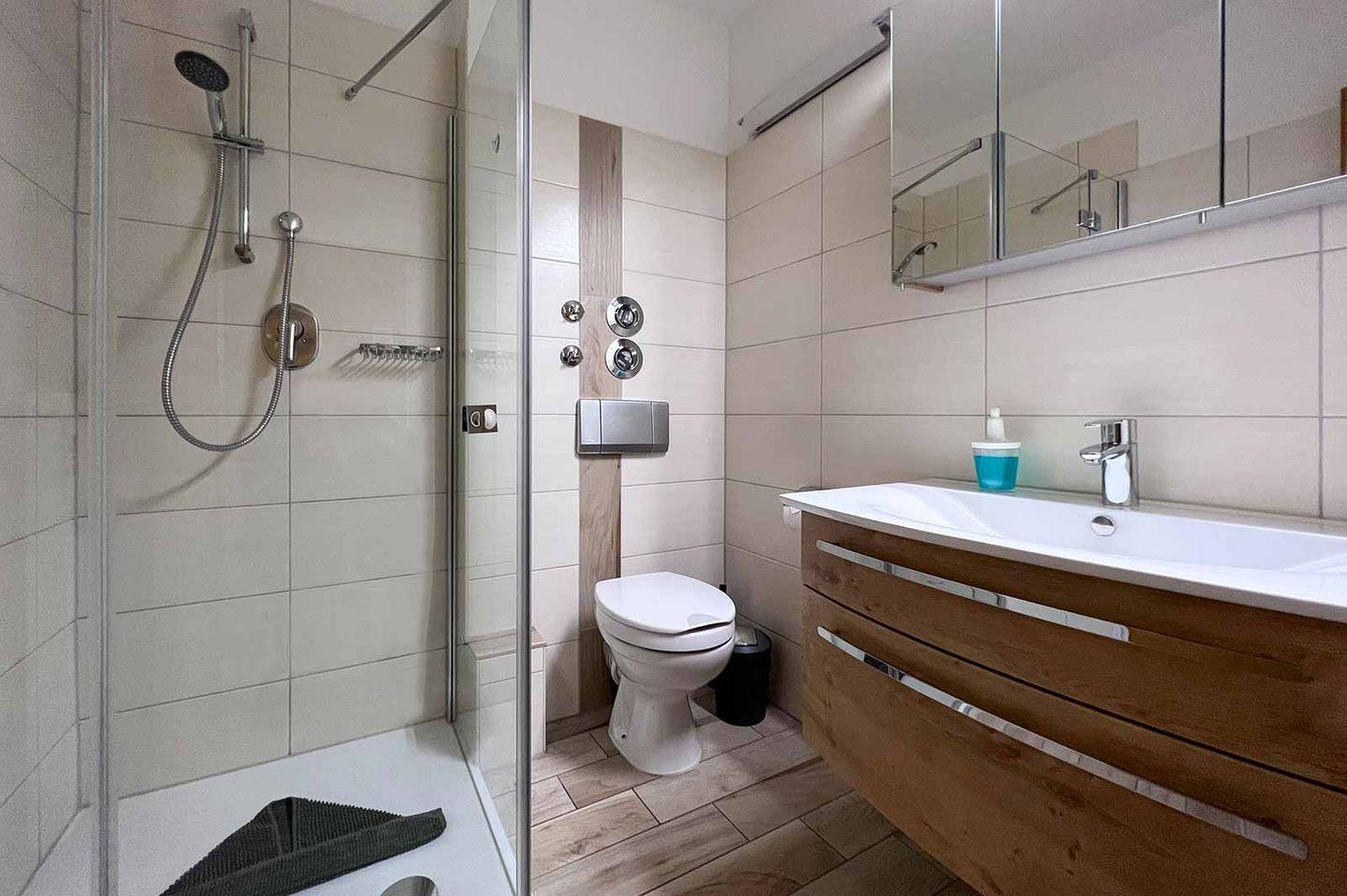 Das Badezimmer ist modern und ansprechend gestaltet und beinhaltet eine Dusche mit Wanne, die eine erholsame Auszeit bietet. Praktische Zusatzfunktionen wie ein Haartrockner und ein Wäscheständer sind ebenfalls vorhanden. Darüber hinaus steht eine Gemeinschaftsnutzung von Waschmaschine und Trockner zur Verfügung.