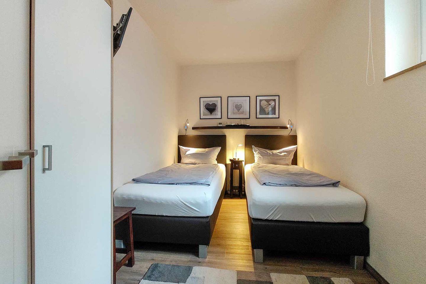 Zusätzlich zu den zwei Boxspringbetten mit Bodyguard-Matratzen im Schlafzimmer steht ein Schlafsofa im Wohnraum zur Verfügung. Der Esstisch ist ausziehbar und das Badezimmer modern renoviert. WLAN (mit eigenem Router!) steht Ihnen in der Wohnung gratis zur Verfügung, außerdem gehört ein fest zugewiesener Garagenplatz zum Angebot.