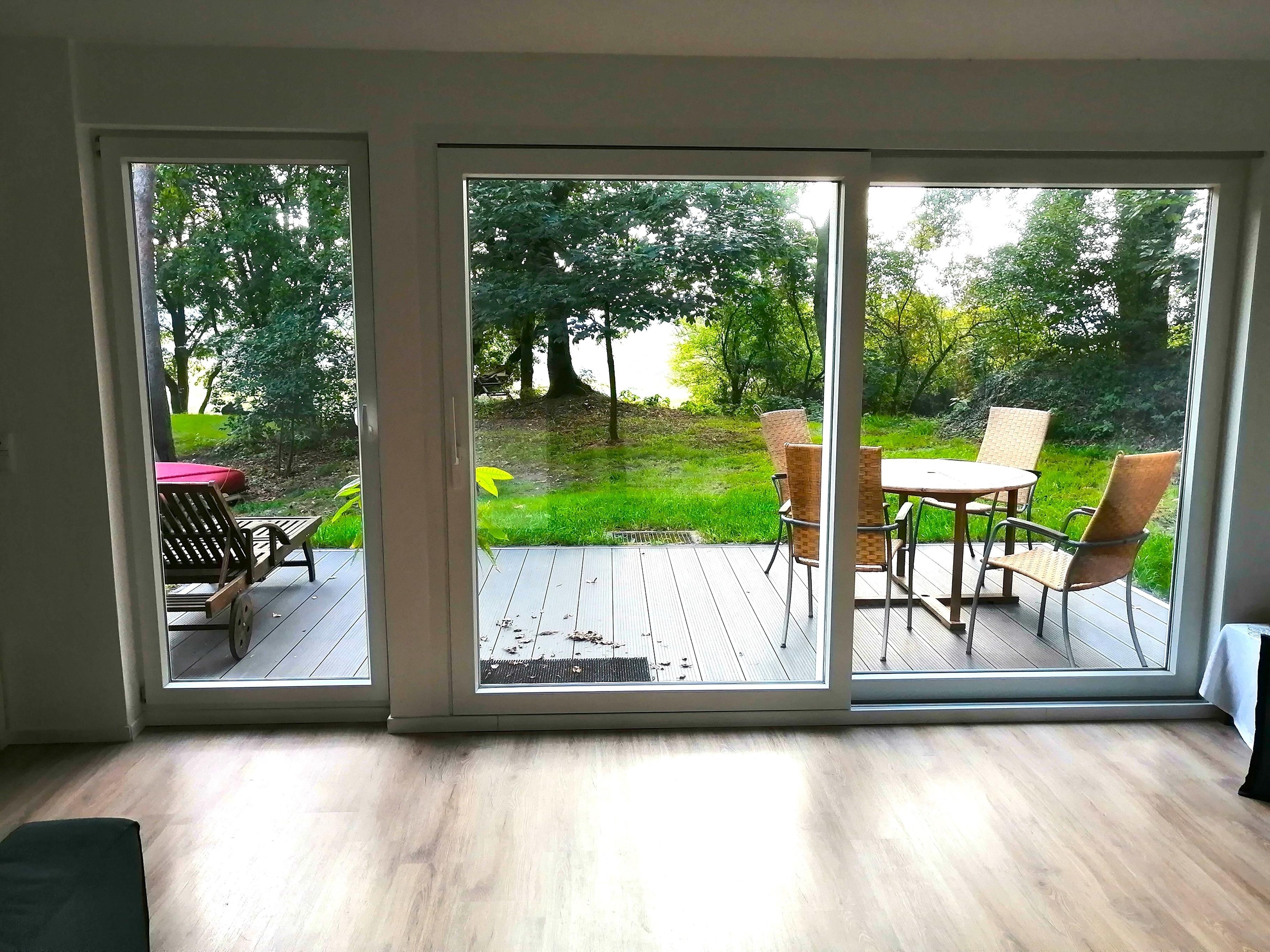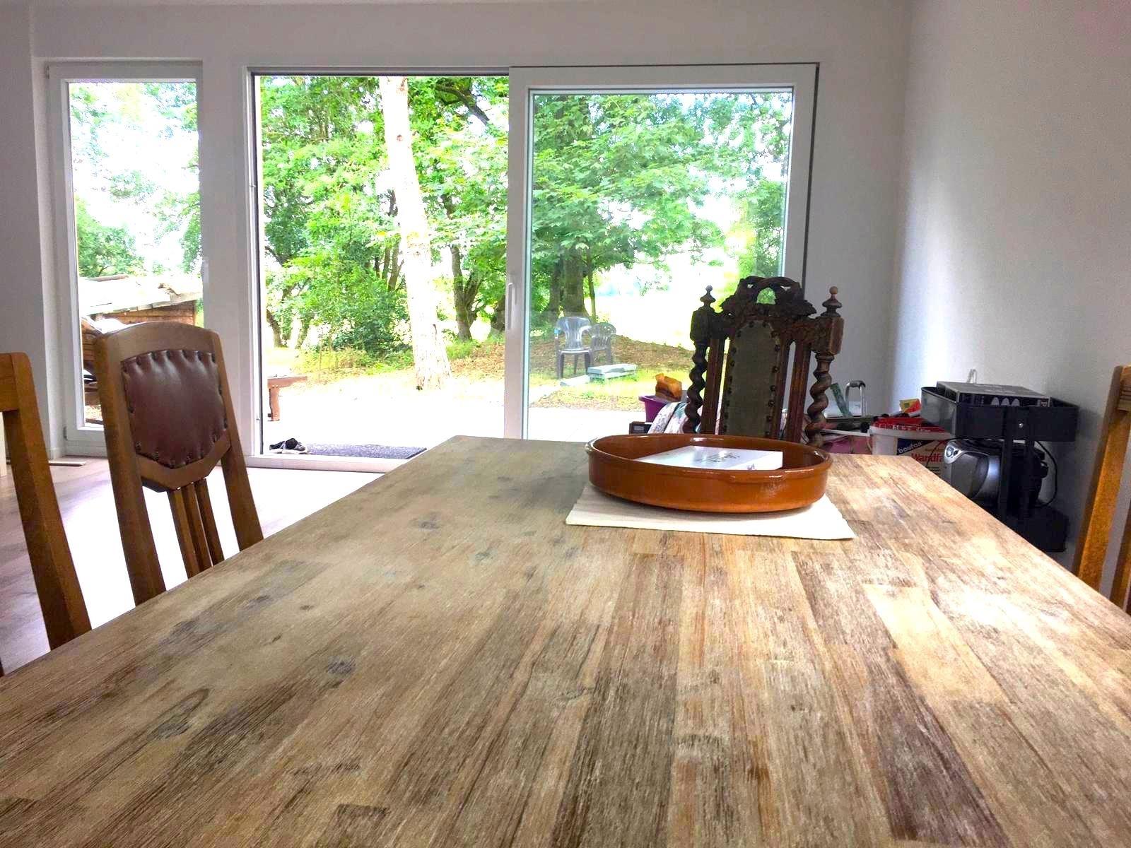 Die Terrasse ist mit einer Sitzgruppe und einem Außentisch möbliert. Im großen Garten befinden sich zudem weitere Außenmöbel zum entspannen.