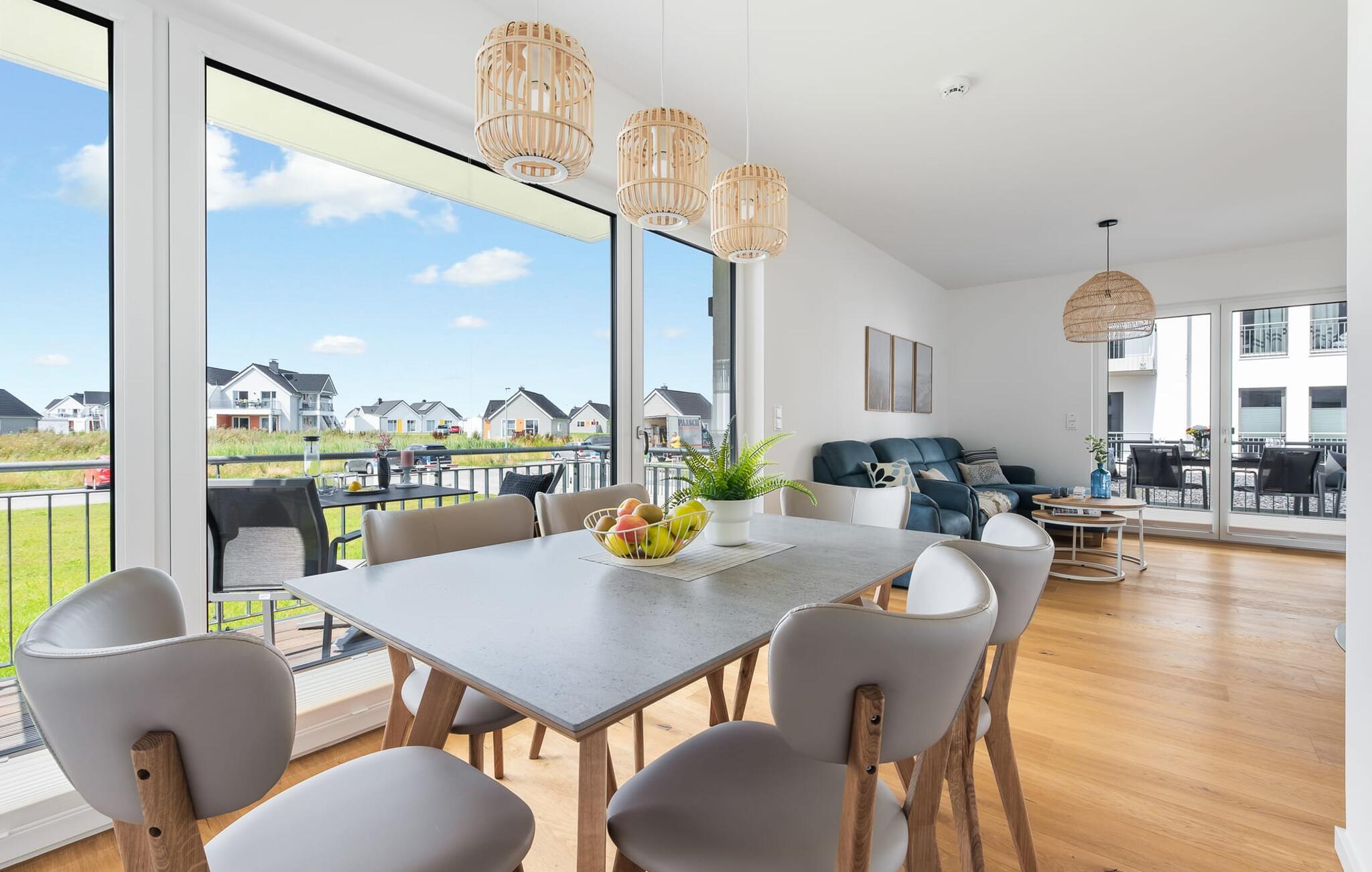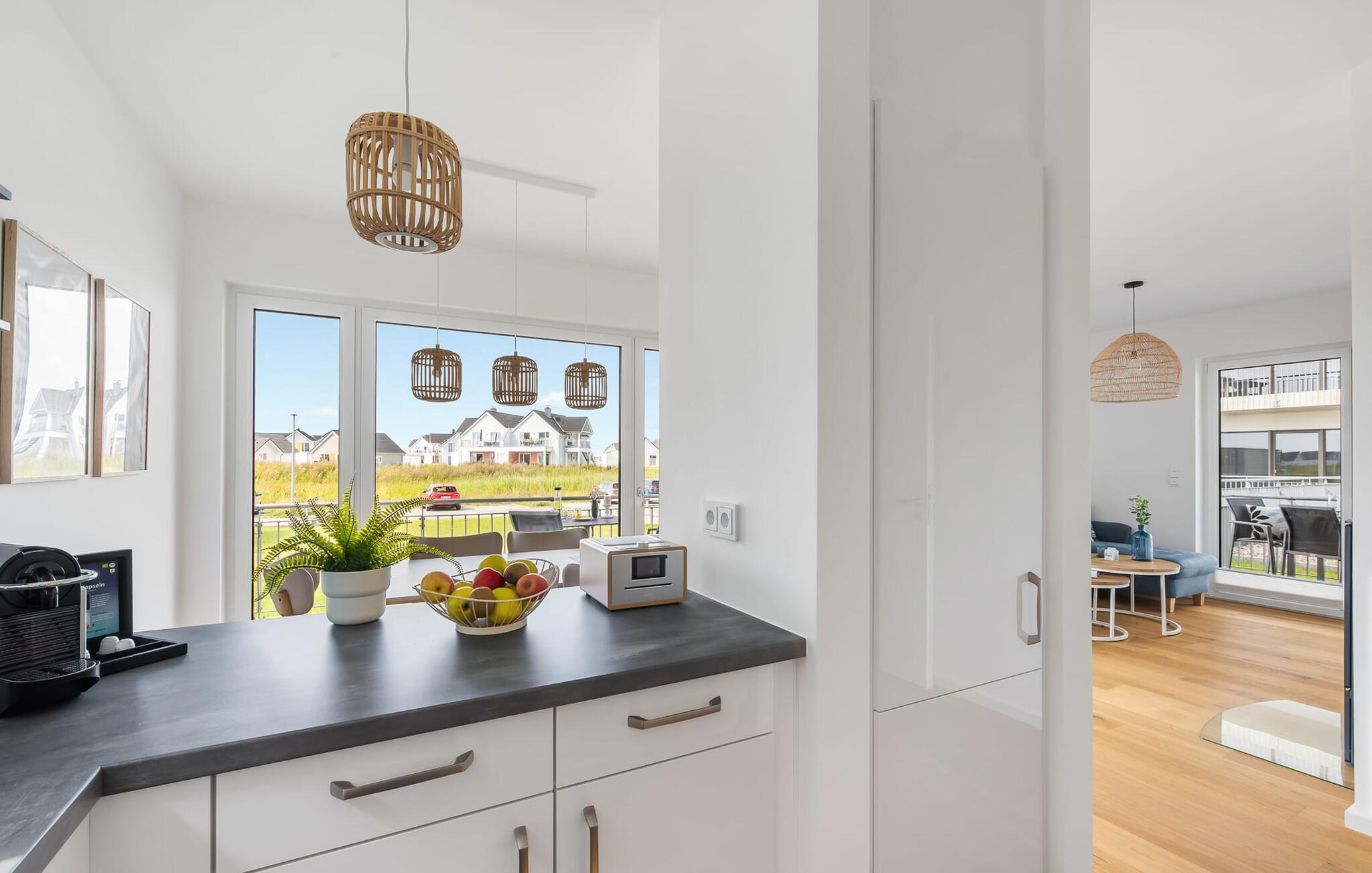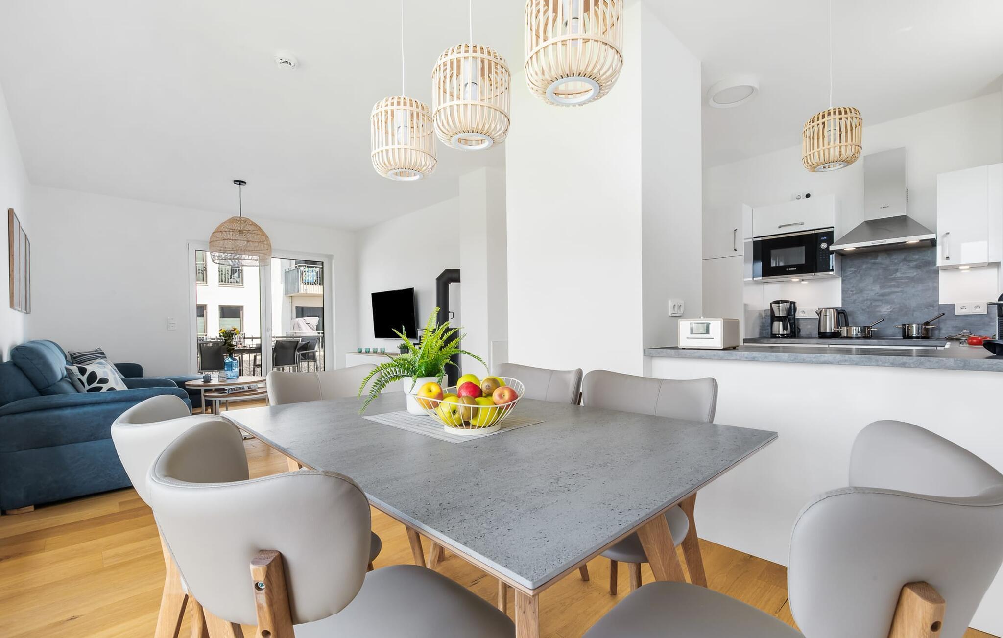 DünenMEER er moderne og højkvalitets indrettet i et strandhus-look og byder gæsterne velkommen i en rummelig og lyse stue/spisestue med integreret køkken. Møbleringen med maritim flair gør hver dag til en tur til havet i dine egne fire vægge. Vinduerne fra gulv til loft og den tilstødende terrasse med udsigt over vandet giver dig med det samme følelsen af ??at være hjemme.