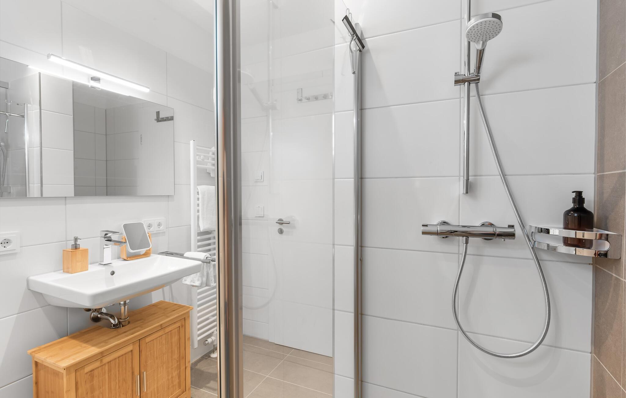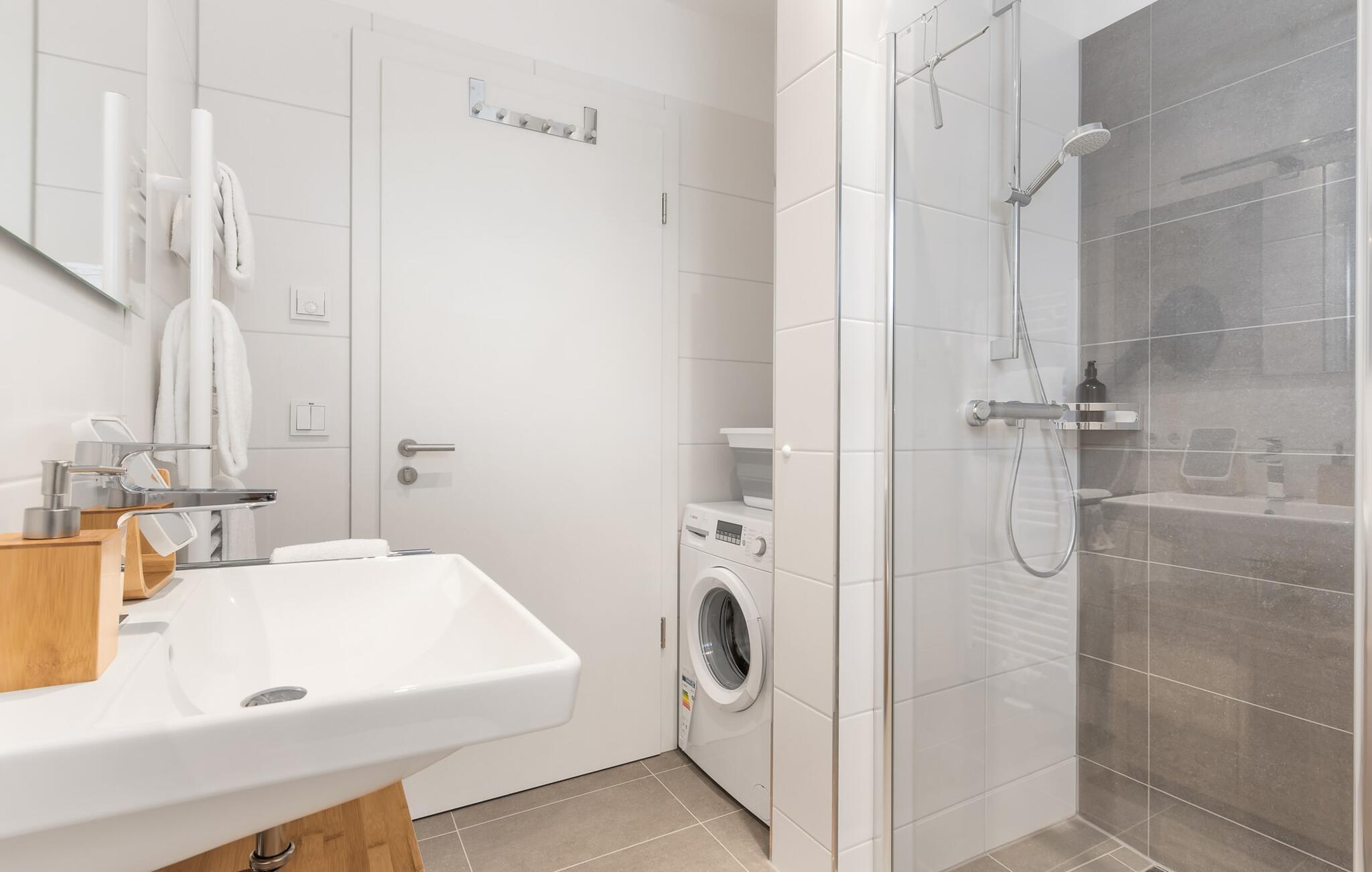 I brusebadet har du et brusebad i gulvniveau og alt hvad du behøver til den daglige pleje og lader intet tilbage at ønske. En vaskemaskine er også integreret i brusebadet.