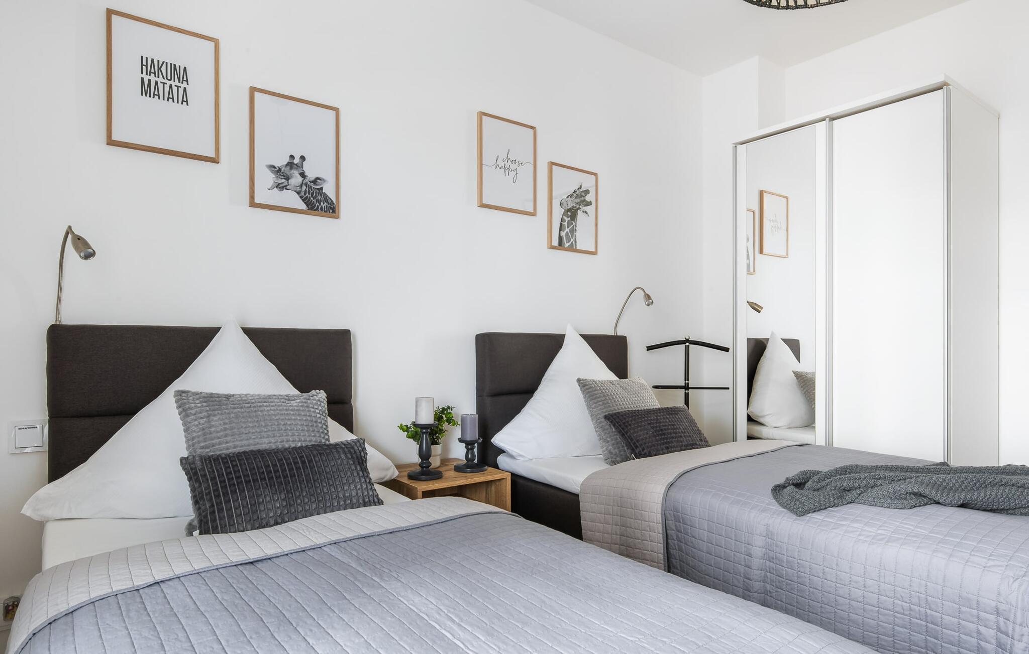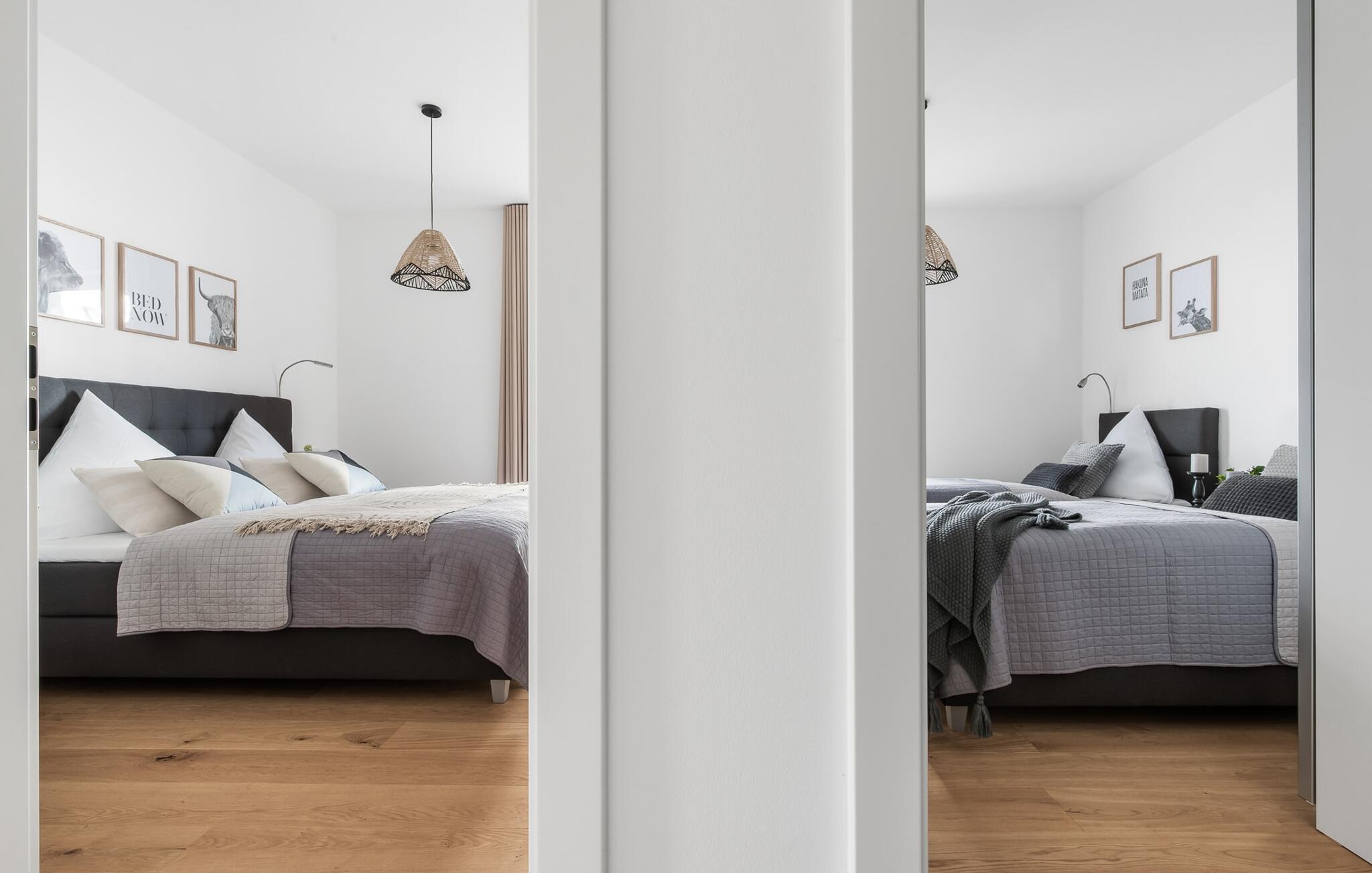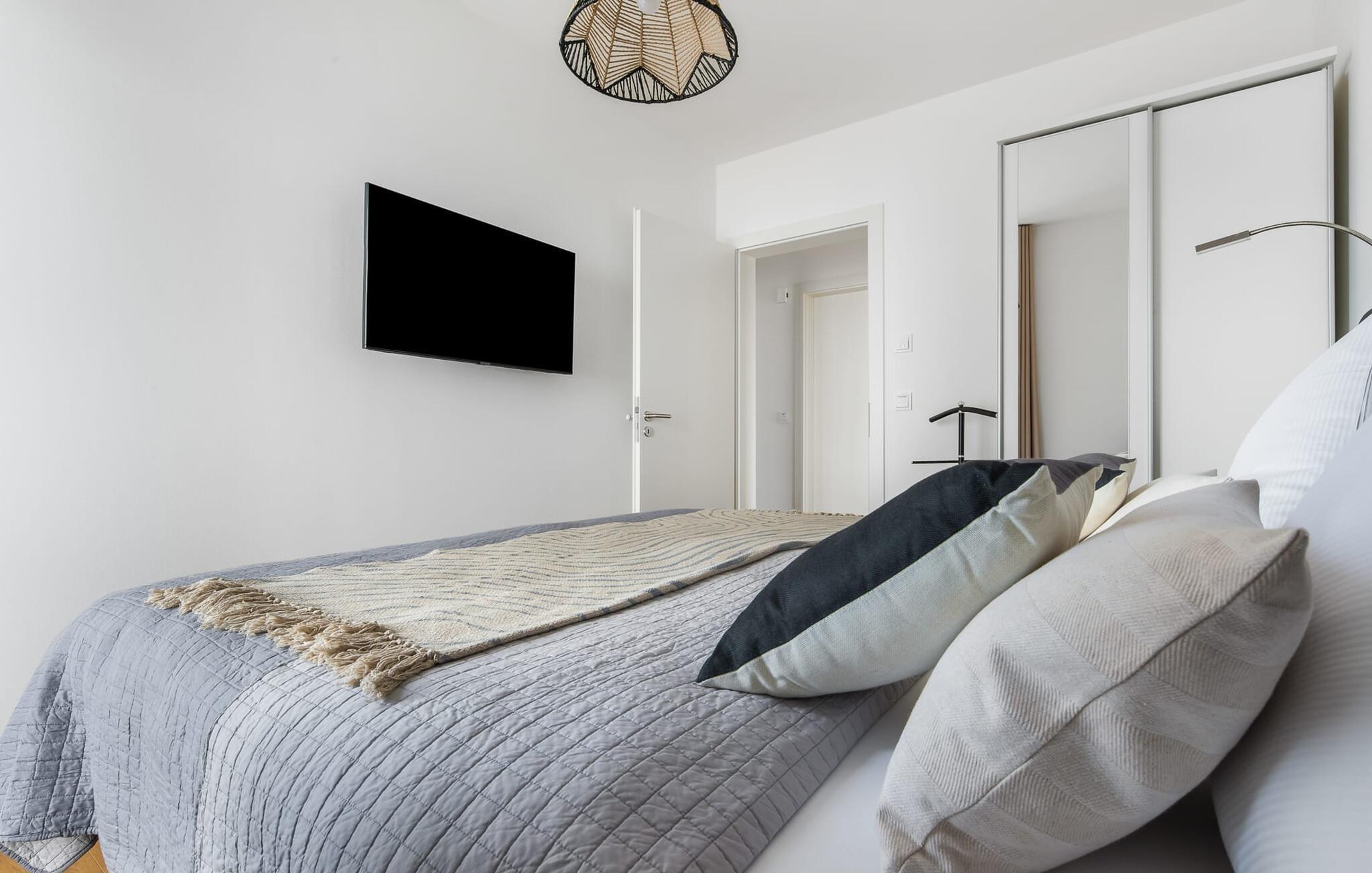 Soveværelset med dobbelt boxmadras, fjernsyn, adgang til terrassen med havudsigt er et højdepunkt i denne idyl og garanterer uforglemmelige ferieøjeblikke. Det andet soveværelse venter dig også med to komfortable enkeltsenge med springmadrasser og et fjernsyn og tilbyder det højeste niveau af sovekomfort. Mørklægningsgardinerne i soveværelserne tilbyder fuldstændig privatliv. Så de smukke drømme kommer helt af sig selv.