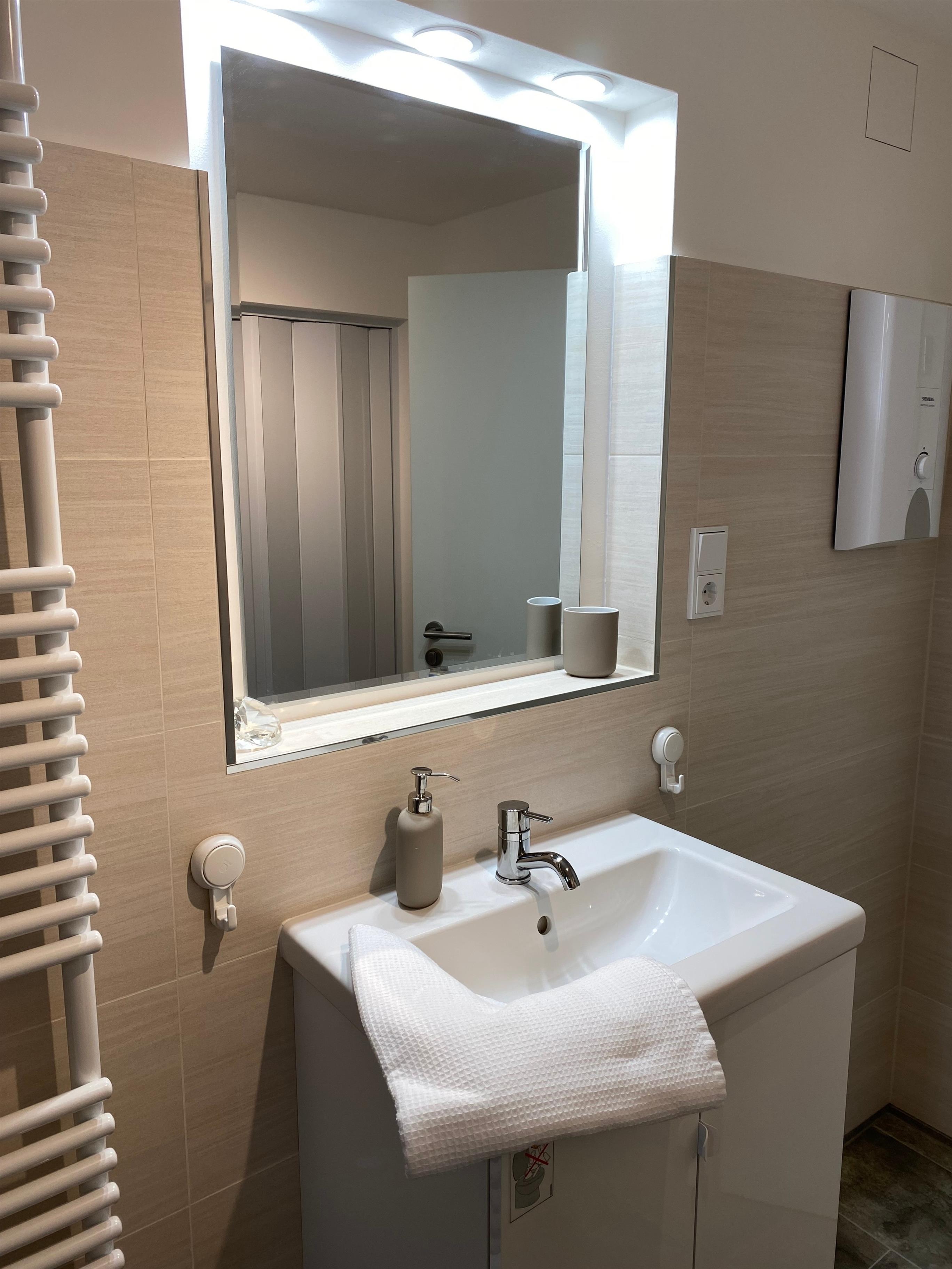 • Geräumiges Badezimmer mit Rundfenster und Dusche