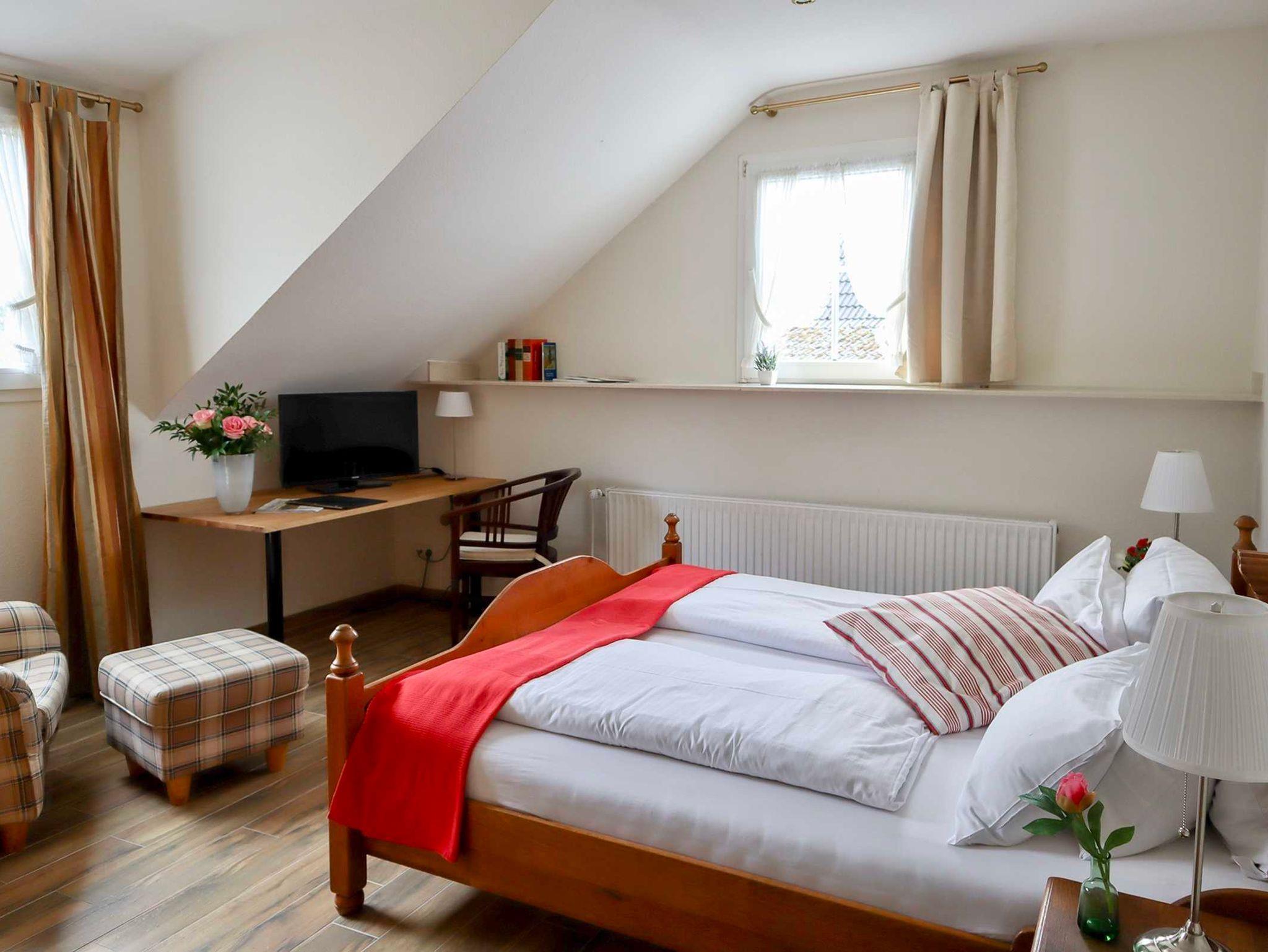 Unsere Doppelzimmer (25- 30 qm²) vereinen Tradition und Moderne. Verschiedene Muster und Farben, angelehnt an den heimischen Landhausstil, prägen die idividuell eingerichteten Zimmer. DieZimmer sind mit Parkett- oder Fliesenboden ausgestattet und verfügen über großzügige Betten (Breite 160cm - 180cm), Bad mit Dusche oder Badewanne mit Duschmöglichkeit & WC, Föhn, Flat-HD-TV, WLAN und einen Schreibtisch. Sie beeindrucken durch liebevolle Details und eignen sich für Einzelreisende, Paare und Familien mit Kleinkindern.
