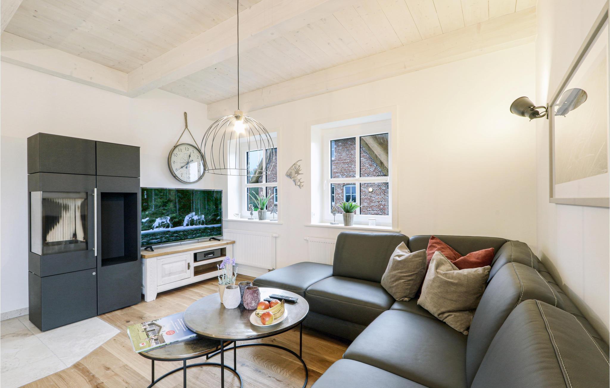 Det halve dobbelthus er utroligt hyggeligt og meget nordtysk med moderne indslag i de flotte, rustikke rammer. Huset ligger i Dagebüll lige bag diget, kun en kort gåtur fra badediget og færgehavnen. Det er udstyret med møbler af høj kvalitet, og alle værelser er rummelige. På den private terrasse kan I grille, solbade, nyde den sunde havluft og bare slappe af, mens børnene leger og boltrer sig i den indhegnede have.