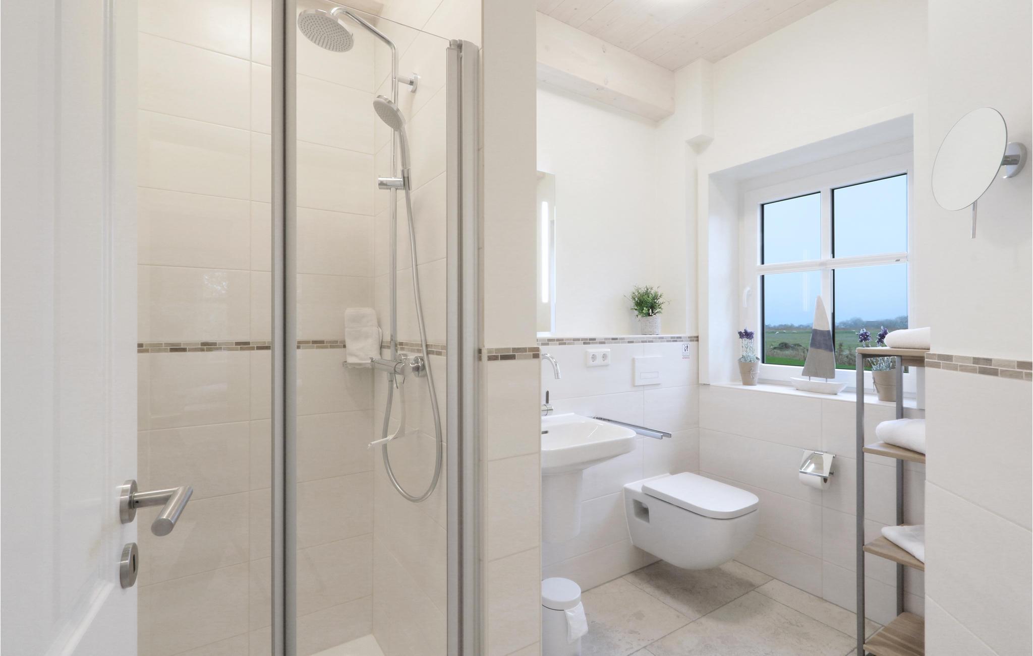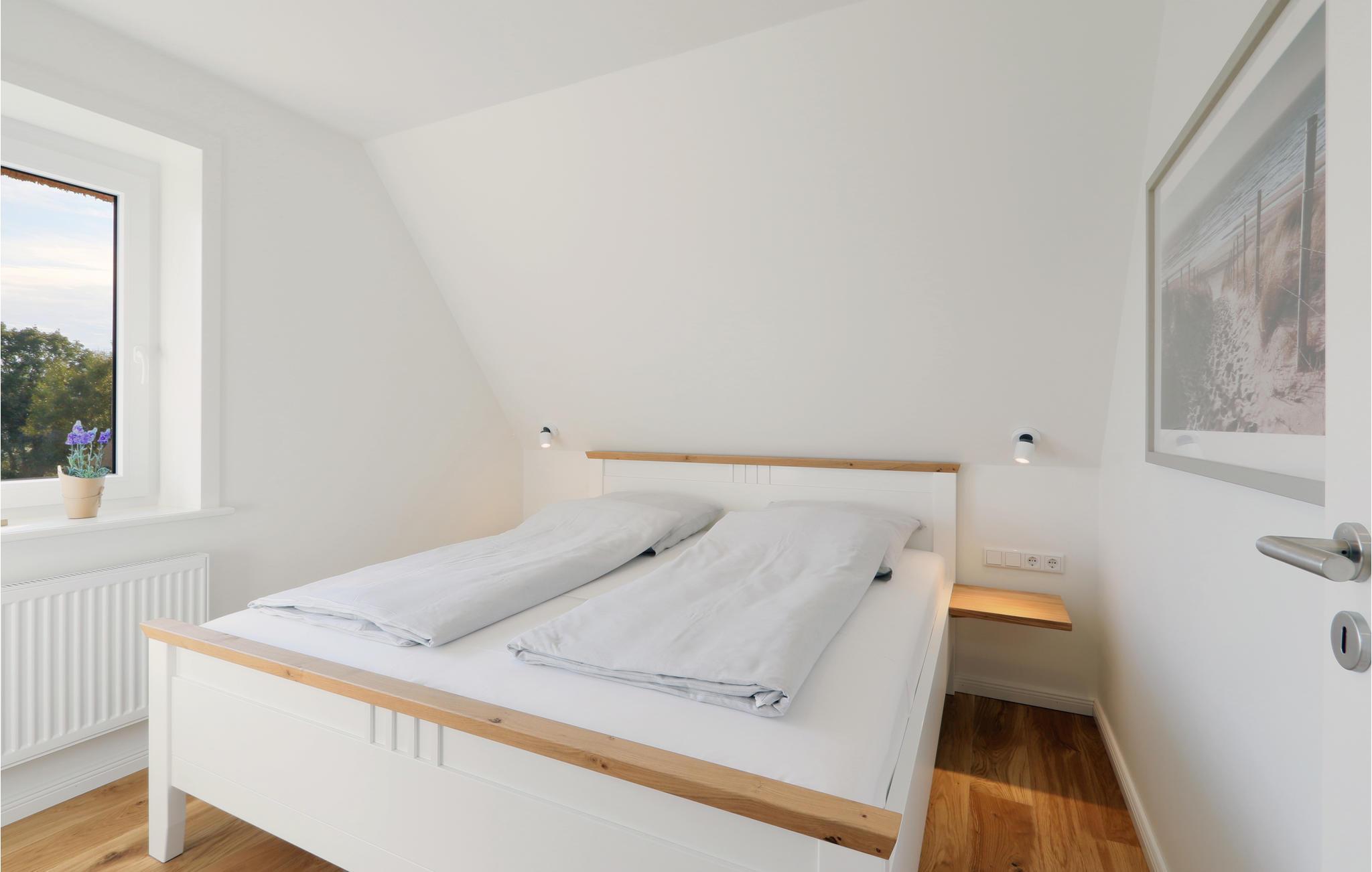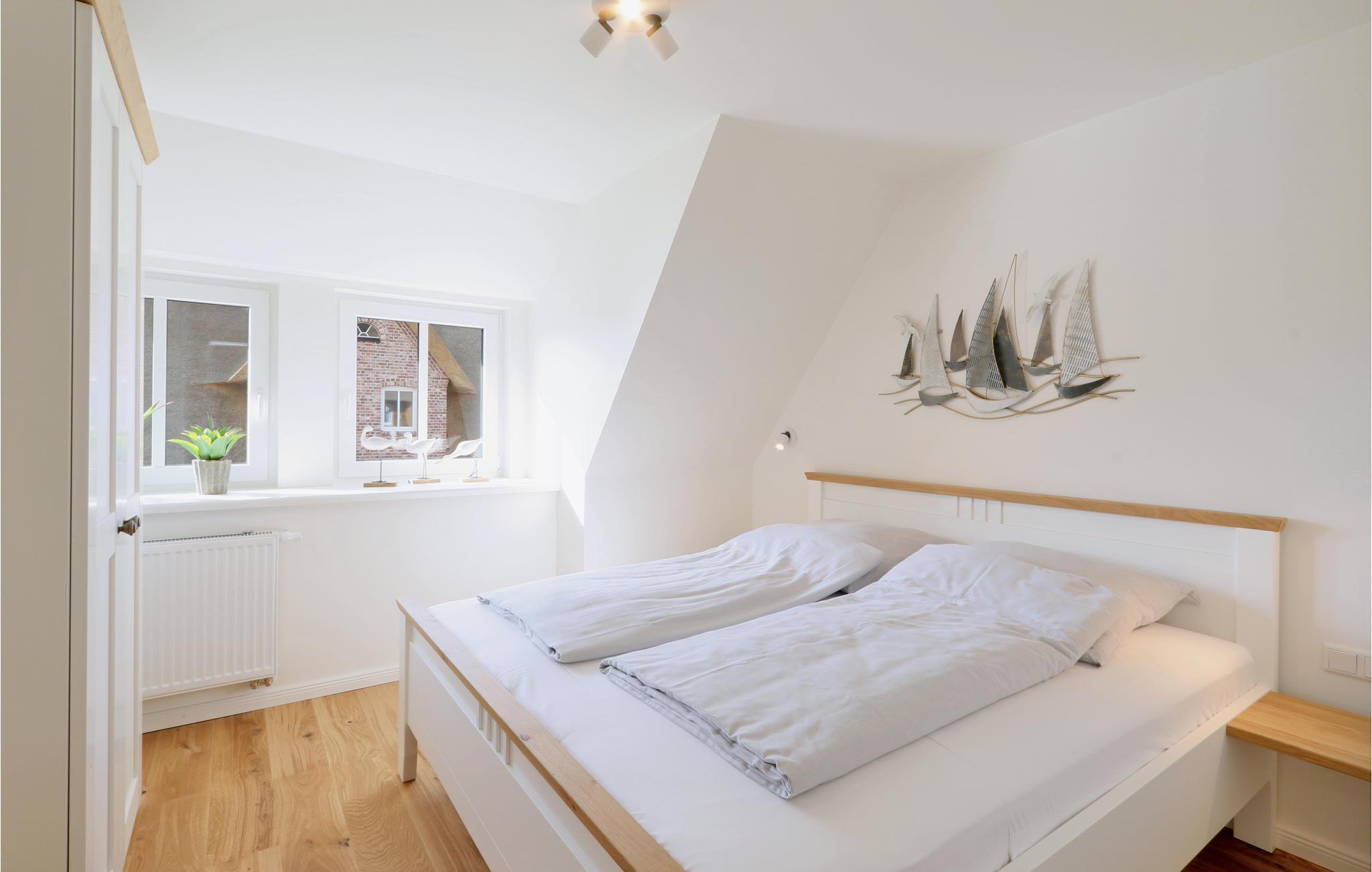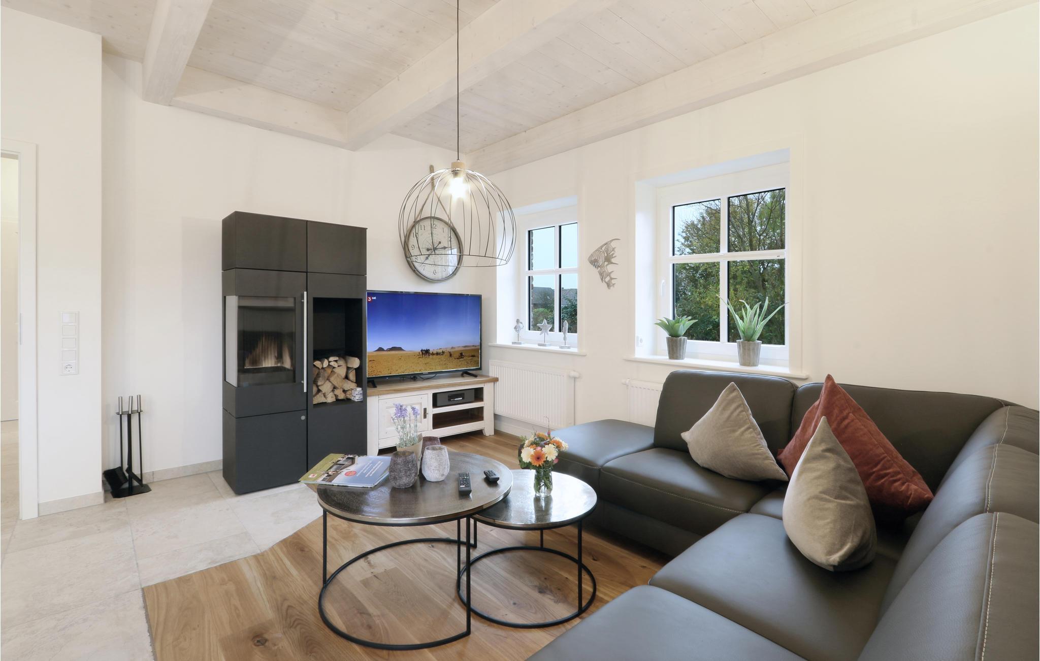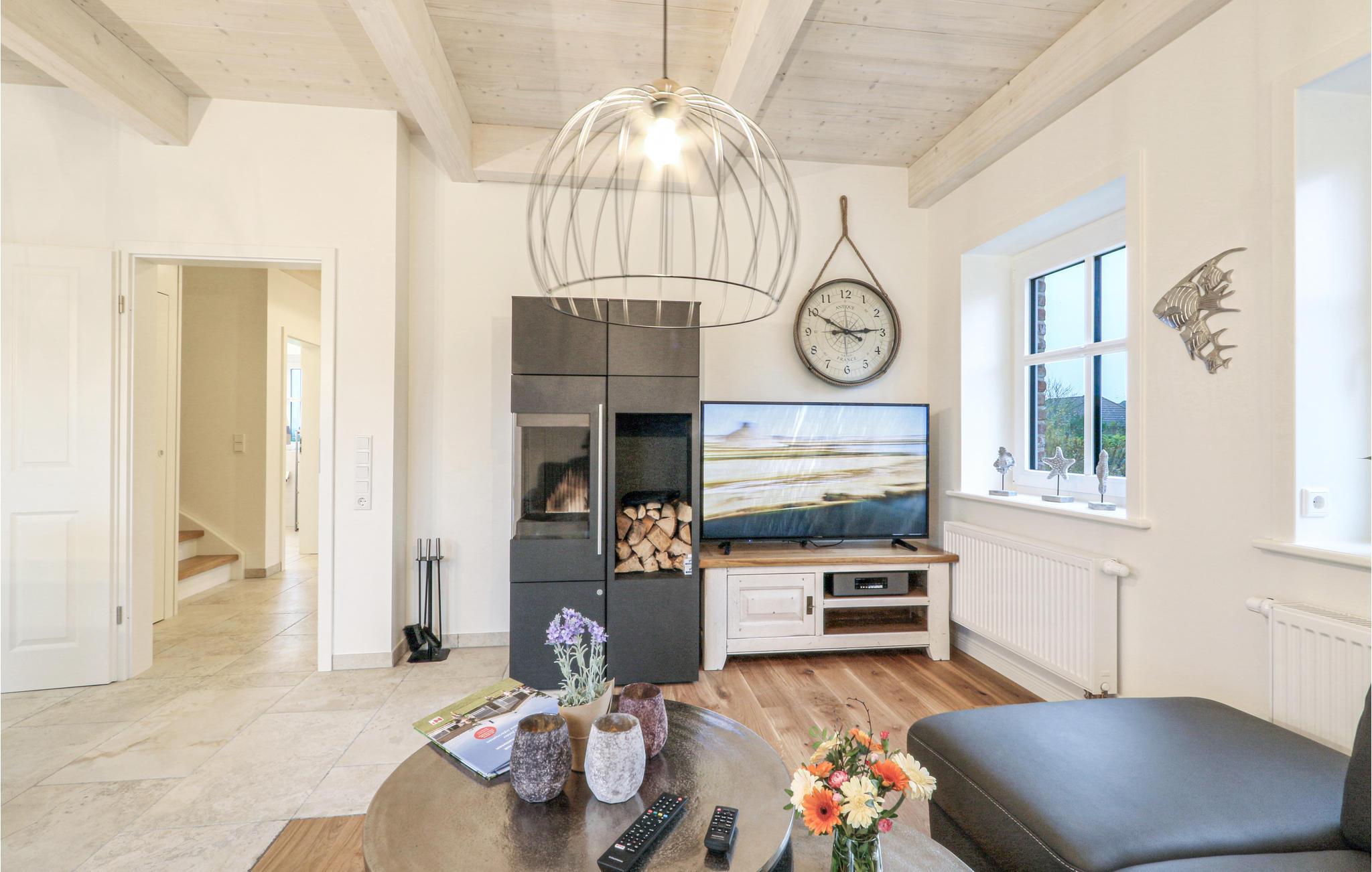 Det halve dobbelthus er utroligt hyggeligt og meget nordtysk med moderne indslag i de flotte, rustikke rammer. Huset ligger i Dagebüll lige bag diget, kun en kort gåtur fra badediget og færgehavnen. Det er udstyret med møbler af høj kvalitet, og alle værelser er rummelige. På den private terrasse kan I grille, solbade, nyde den sunde havluft og bare slappe af, mens børnene leger og boltrer sig i den indhegnede have.