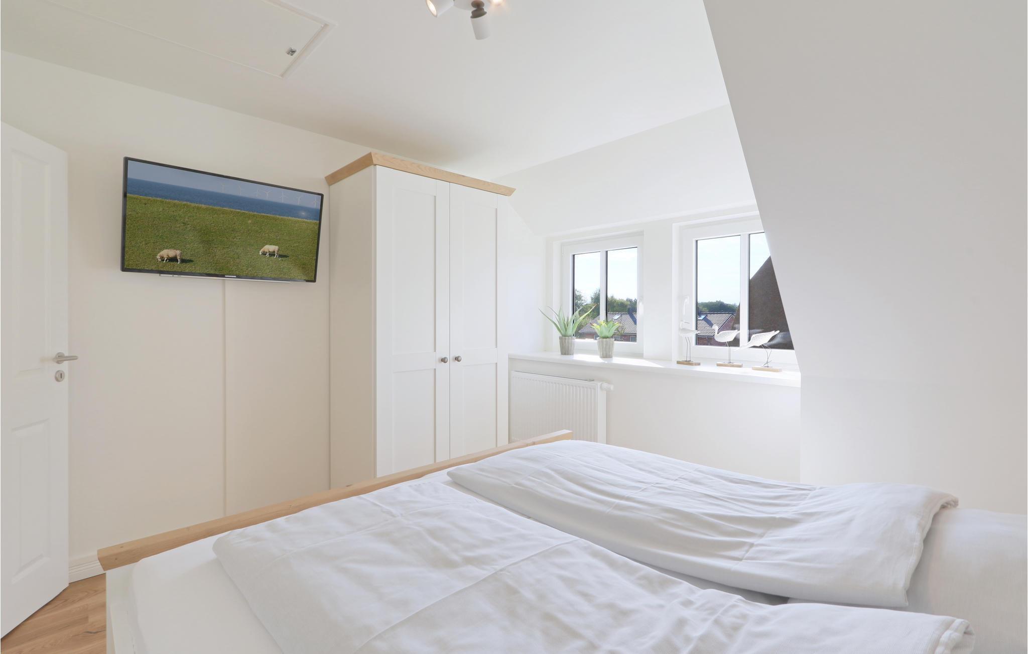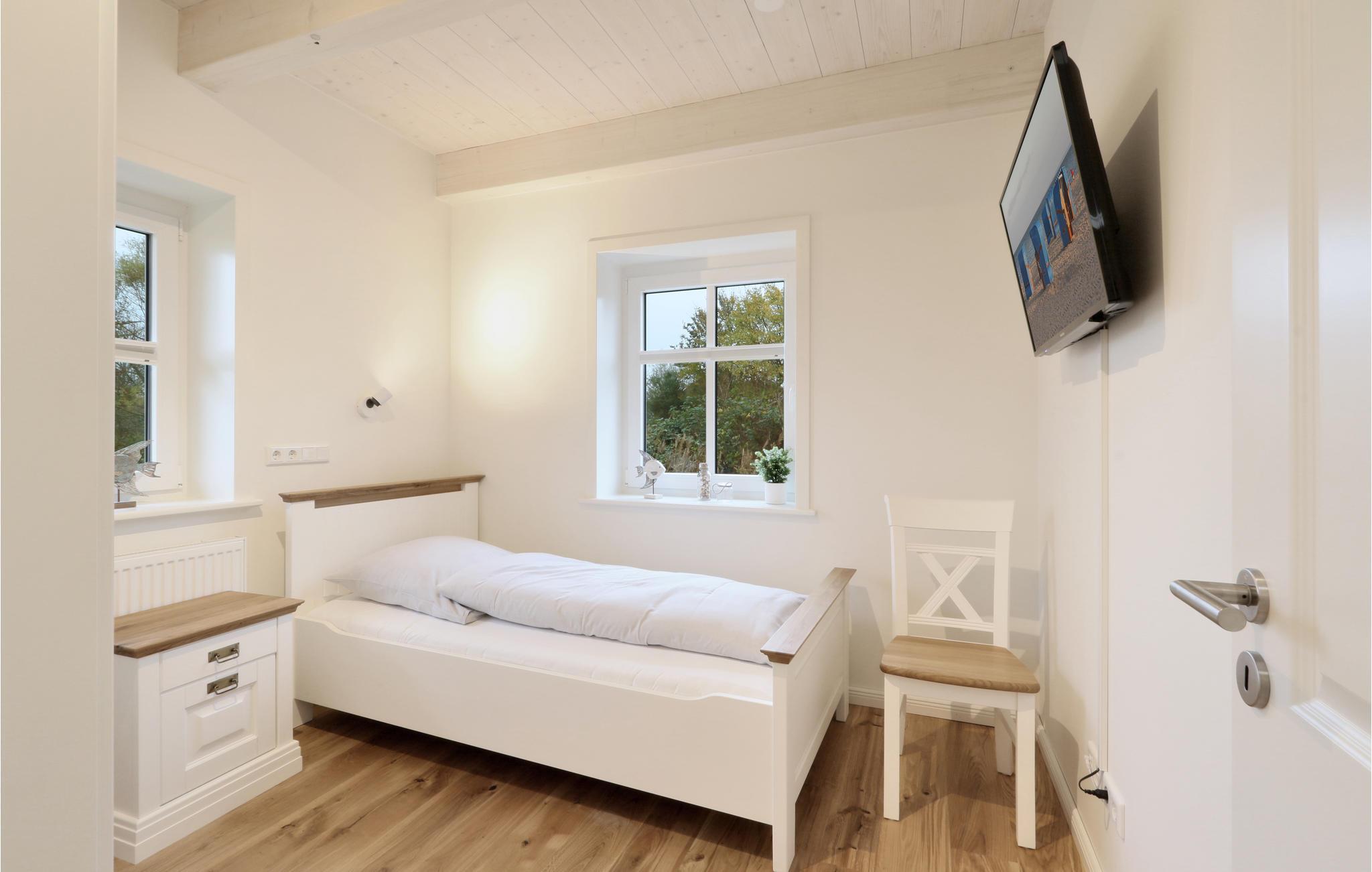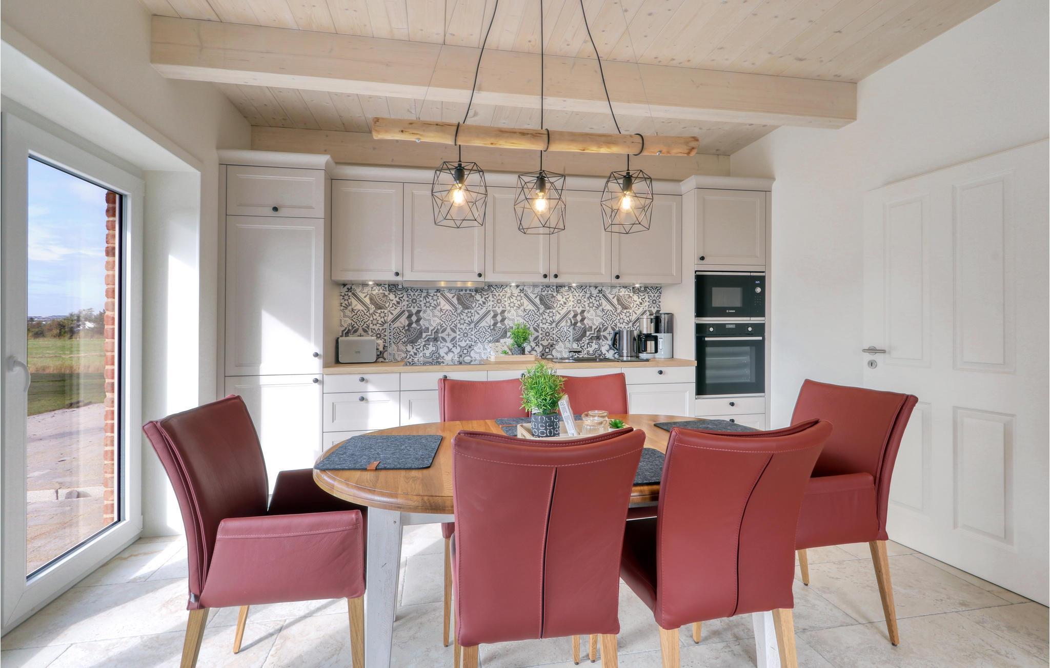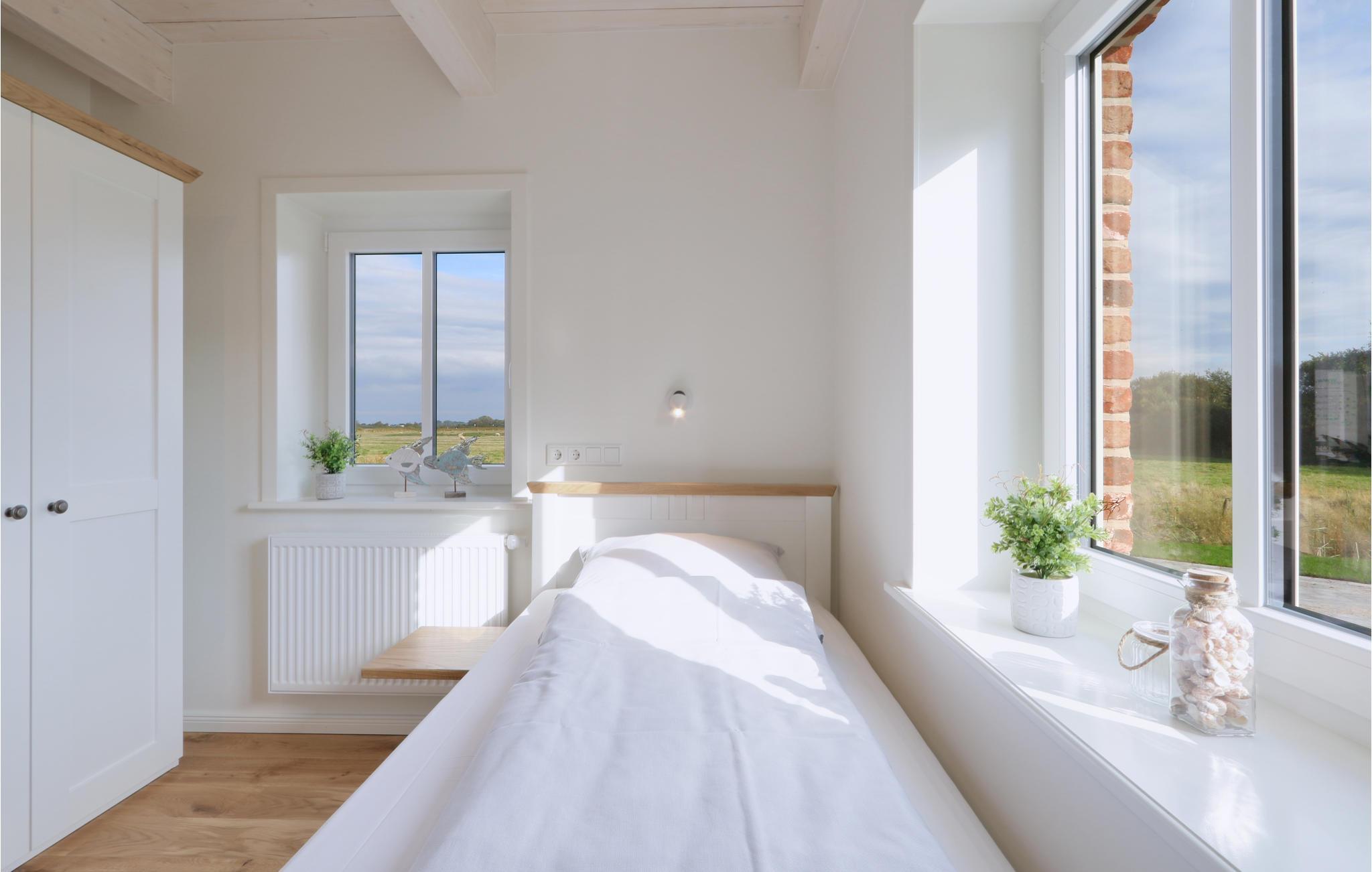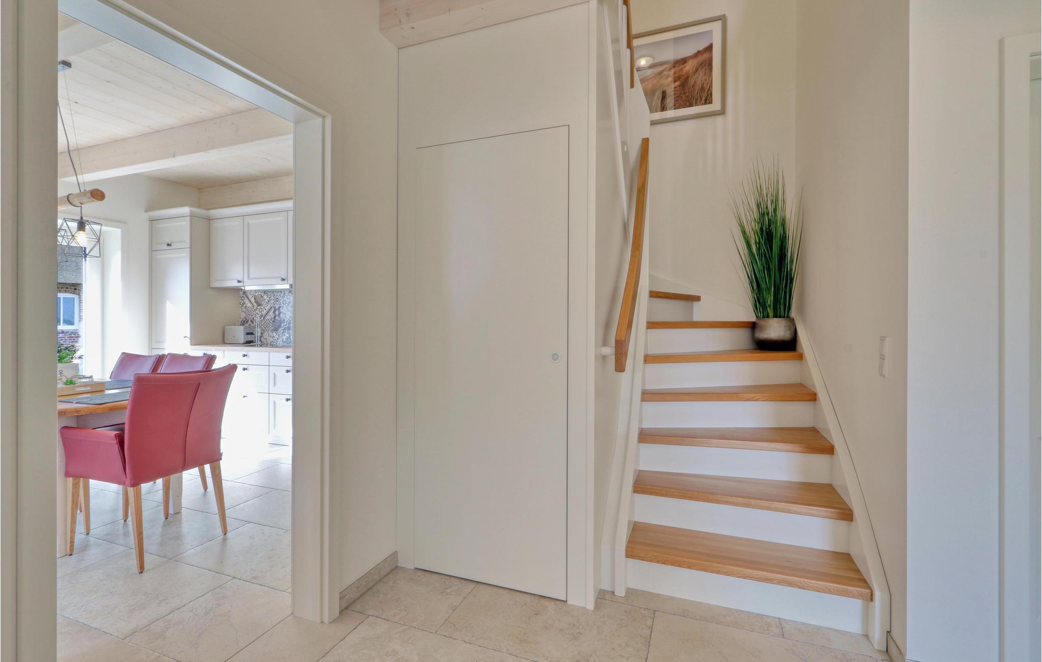 Det halve dobbelthus er utroligt hyggeligt og meget nordtysk med moderne indslag i de flotte, rustikke rammer. Huset ligger i Dagebüll lige bag diget, kun en kort gåtur fra badediget og færgehavnen. Det er udstyret med møbler af høj kvalitet, og alle værelser er rummelige. På den private terrasse kan I grille, solbade, nyde den sunde havluft og bare slappe af, mens børnene leger og boltrer sig i den indhegnede have.