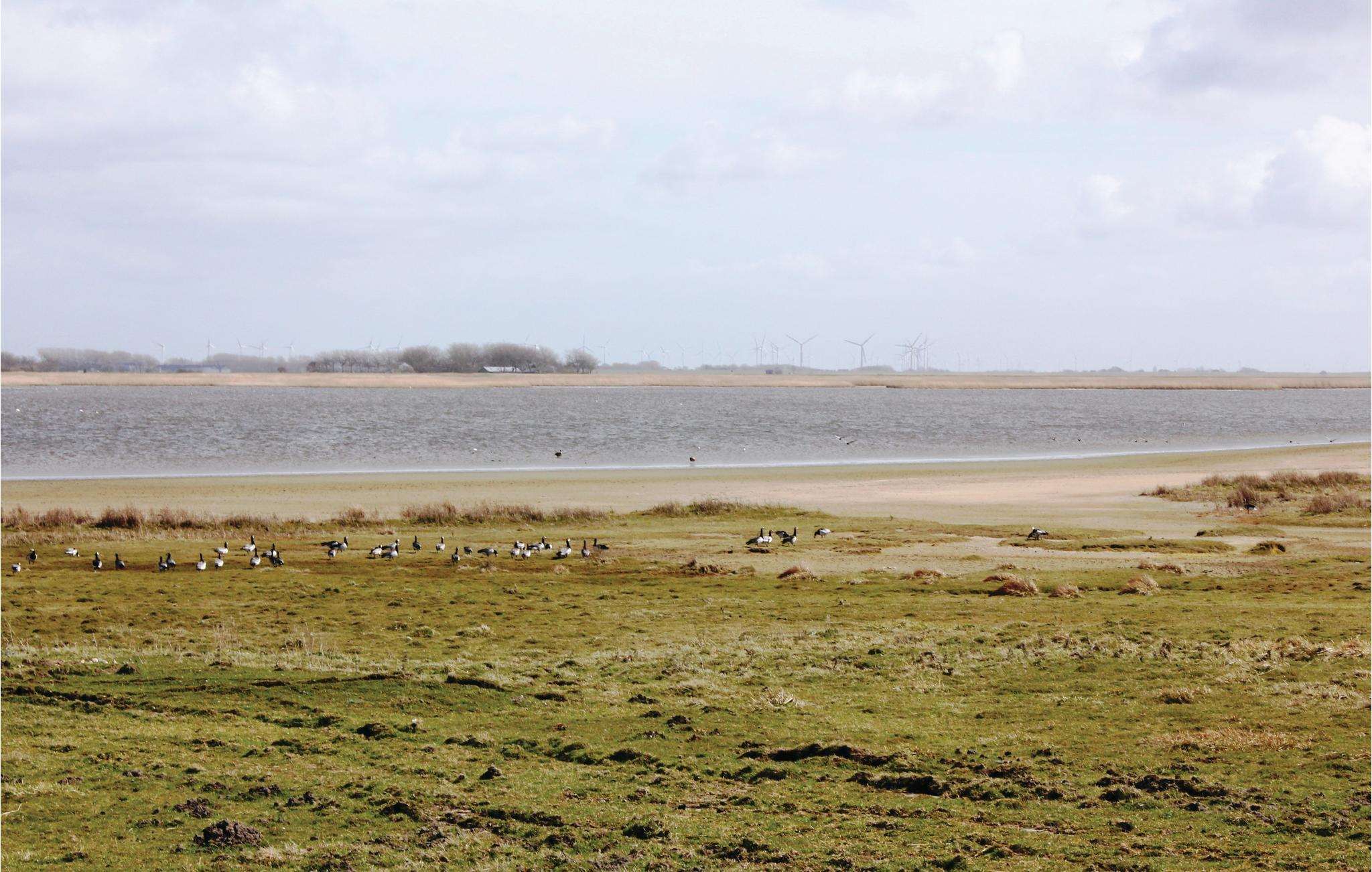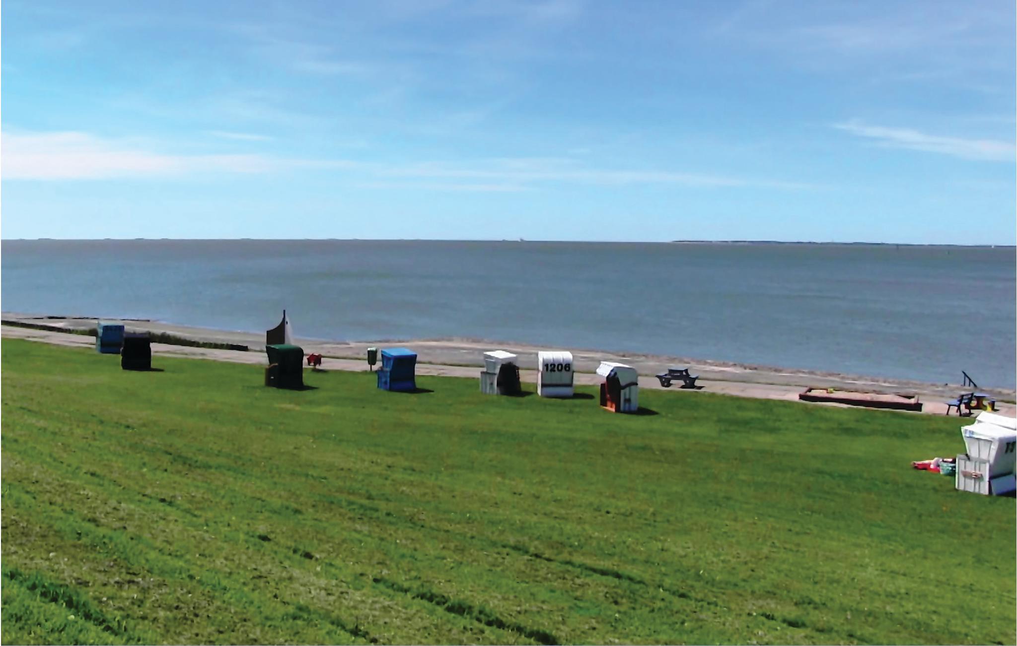 Feriehuset ligger kun 200 m fra Vadehavet og fra Dagebülls stedsegrønne naturstrand, pyntet med de karakteristiske strandkurvestole. De mange diger i området er perfekte til ture på cykel. Hvis I ikke har cykler med, kan de lejes i feriehusbyen.