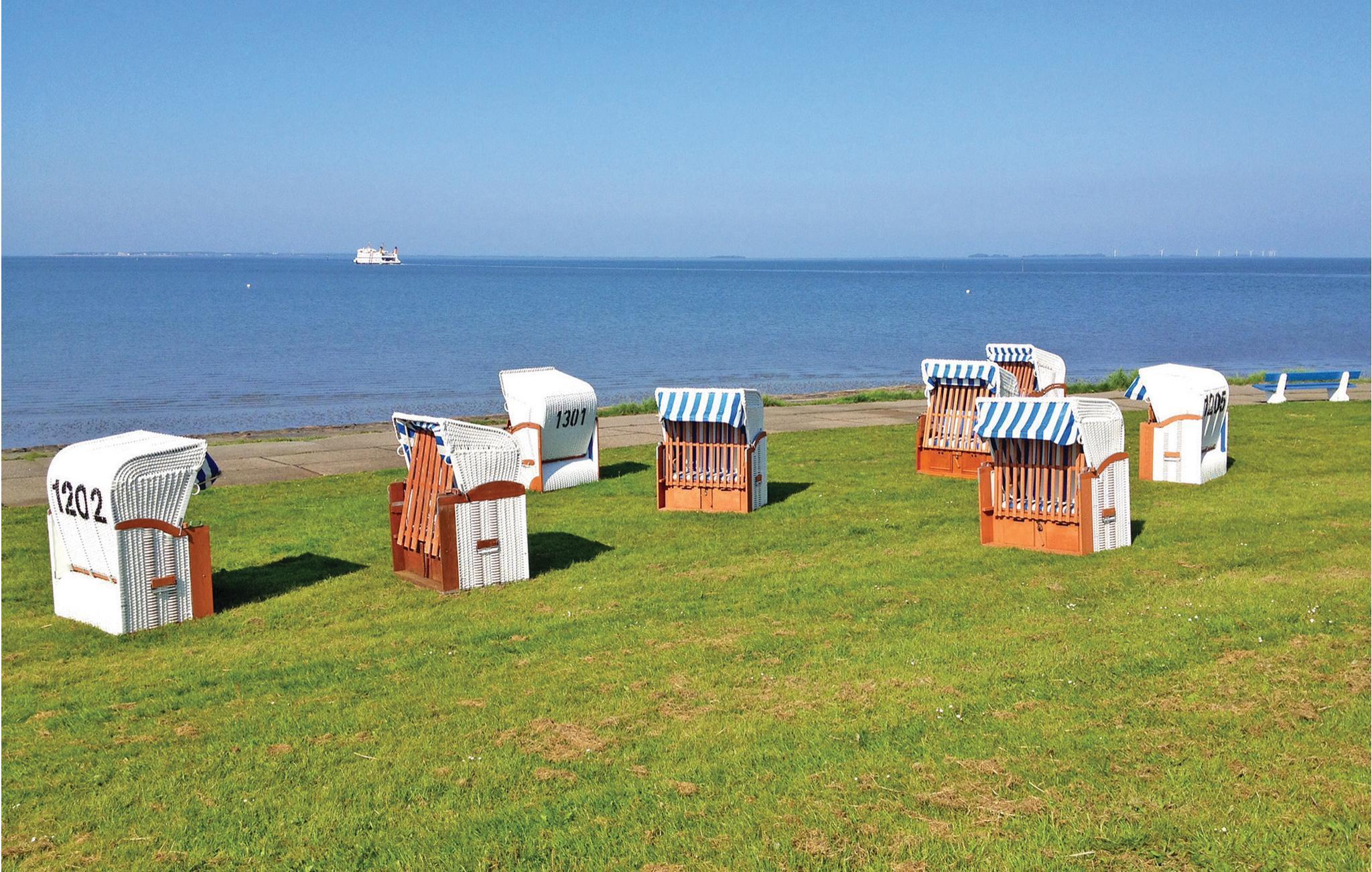 Feriehuset ligger kun 200 m fra Vadehav og fra Dagebülls stedsegrønne naturstrand, pyntet med de karakteristiske strandkurvestole. De mange diger i området er perfekte til ture på cykel. Hvis I ikke har cykler med, kan de lejes i feriehusbyen.