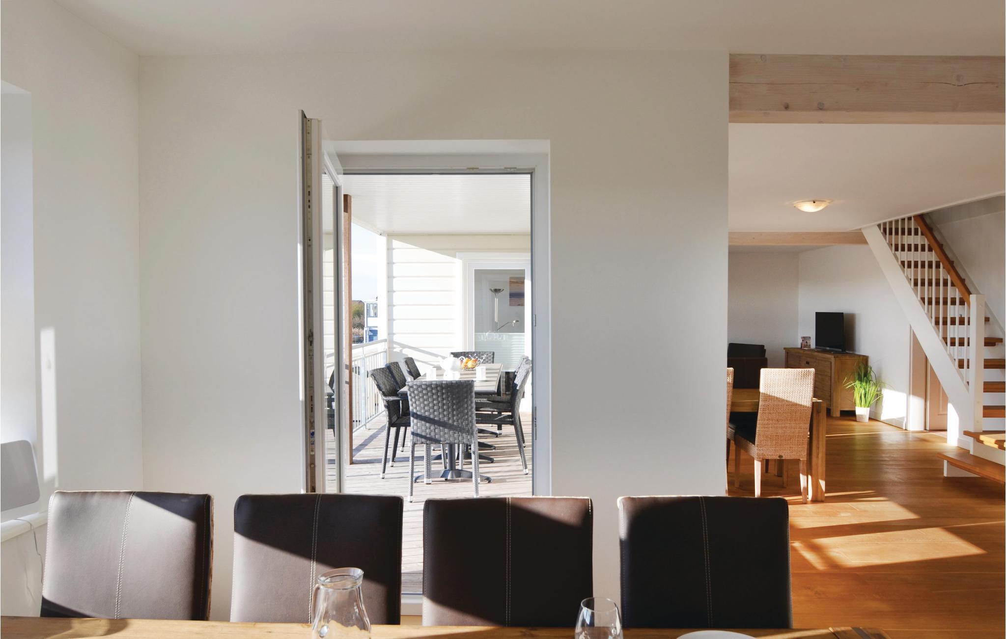 I stuen kan I hygge jer i sofahjørnet af høj kvalitet, og der er naturligvis også et stort spisebord. De fire soveværelser ligger lige under taget, på anden sal. Bemærk, at sengene vender mod tagvæggen, så der er lidt lav siddehøjde i hovedenden.