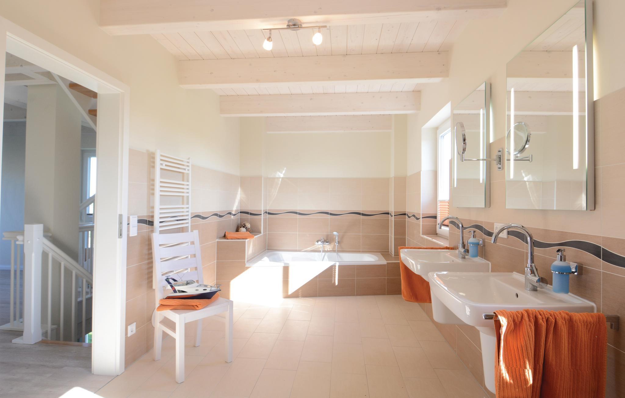 Her har I over 100 dejlige m² til rådighed til en skøn afslappet ferie. Når solen skinner, kan I hygge jer på jeres egen terrasse eller balkonen med god plads til hele familien. På terrassen kan bare sidde og nyde den friske havluft. Især kan badeværelset på første sal fremhæves, her er et kæmpe badekar, som nemt rummer to personer, og en stor sauna (første sal).