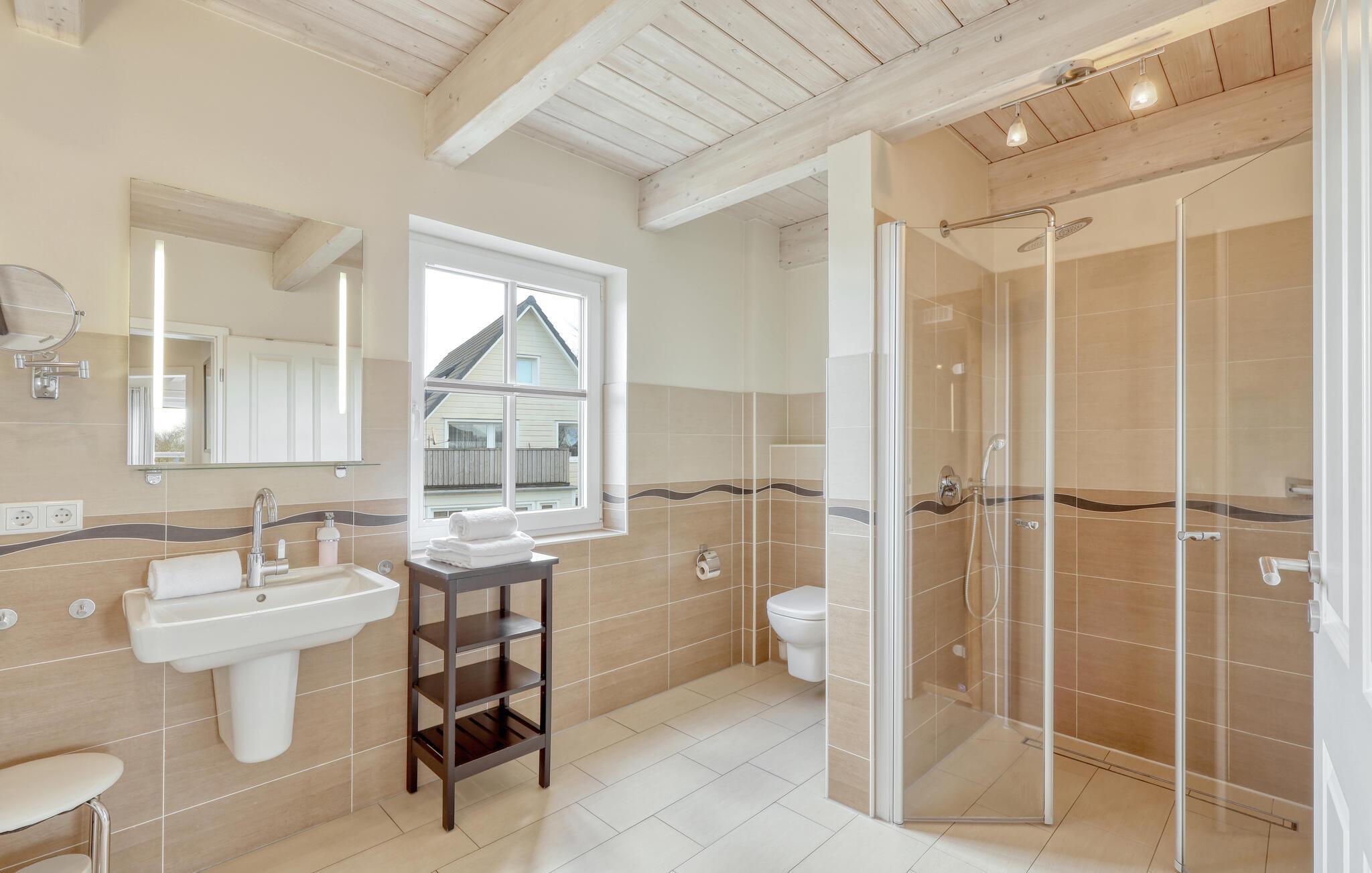 Et af soveværelserne og husets andet badeværelse (uden trin i brusekabinen) ligger i stueplan, så huset også er praktisk for de gæster, der ikke er så glade for at gå på trapper. Da huset ligger på en indhegnet grund, egner det sig både til børnefamilier med mindre børn og til jer, der har hunden med på ferie.