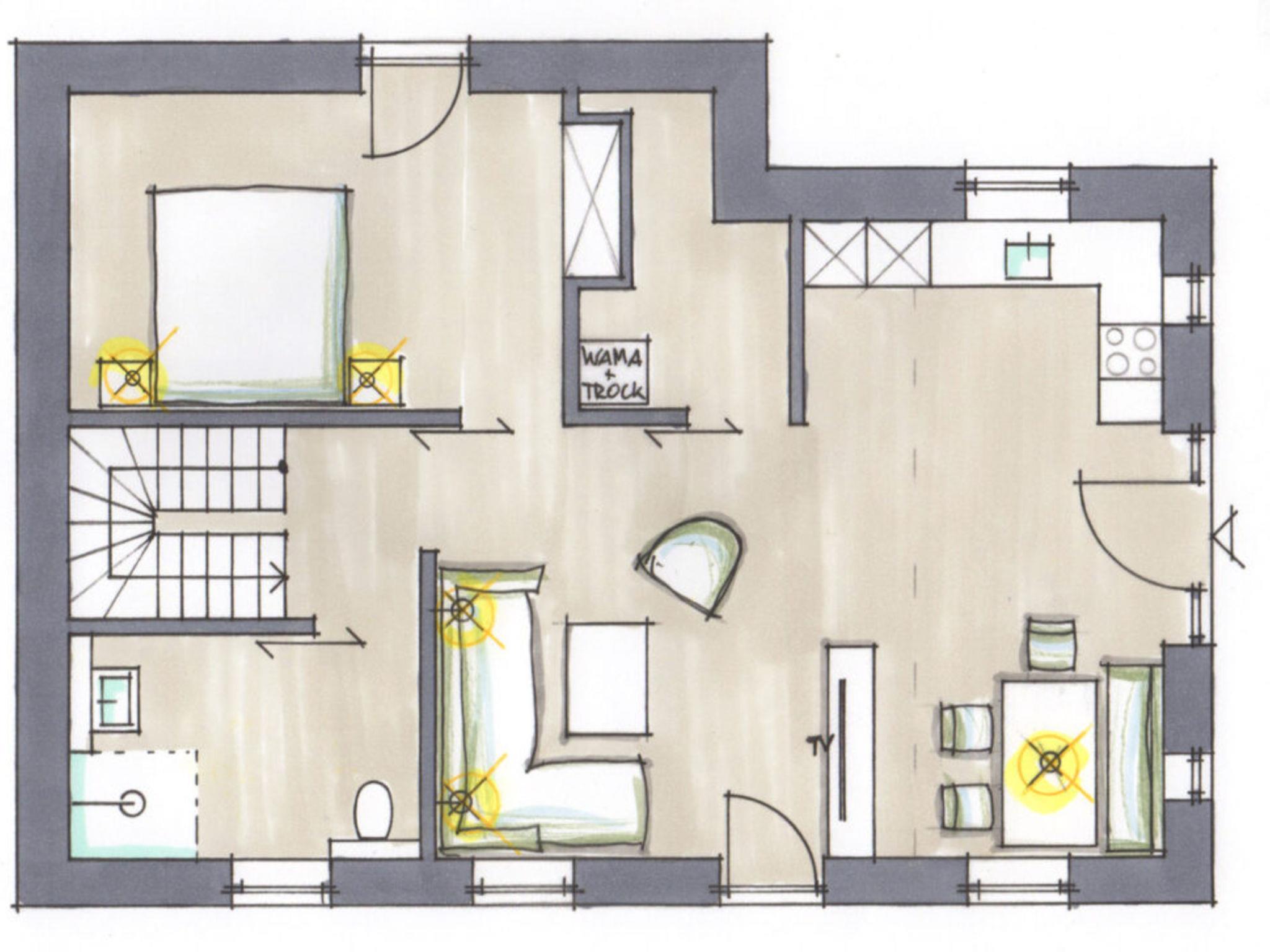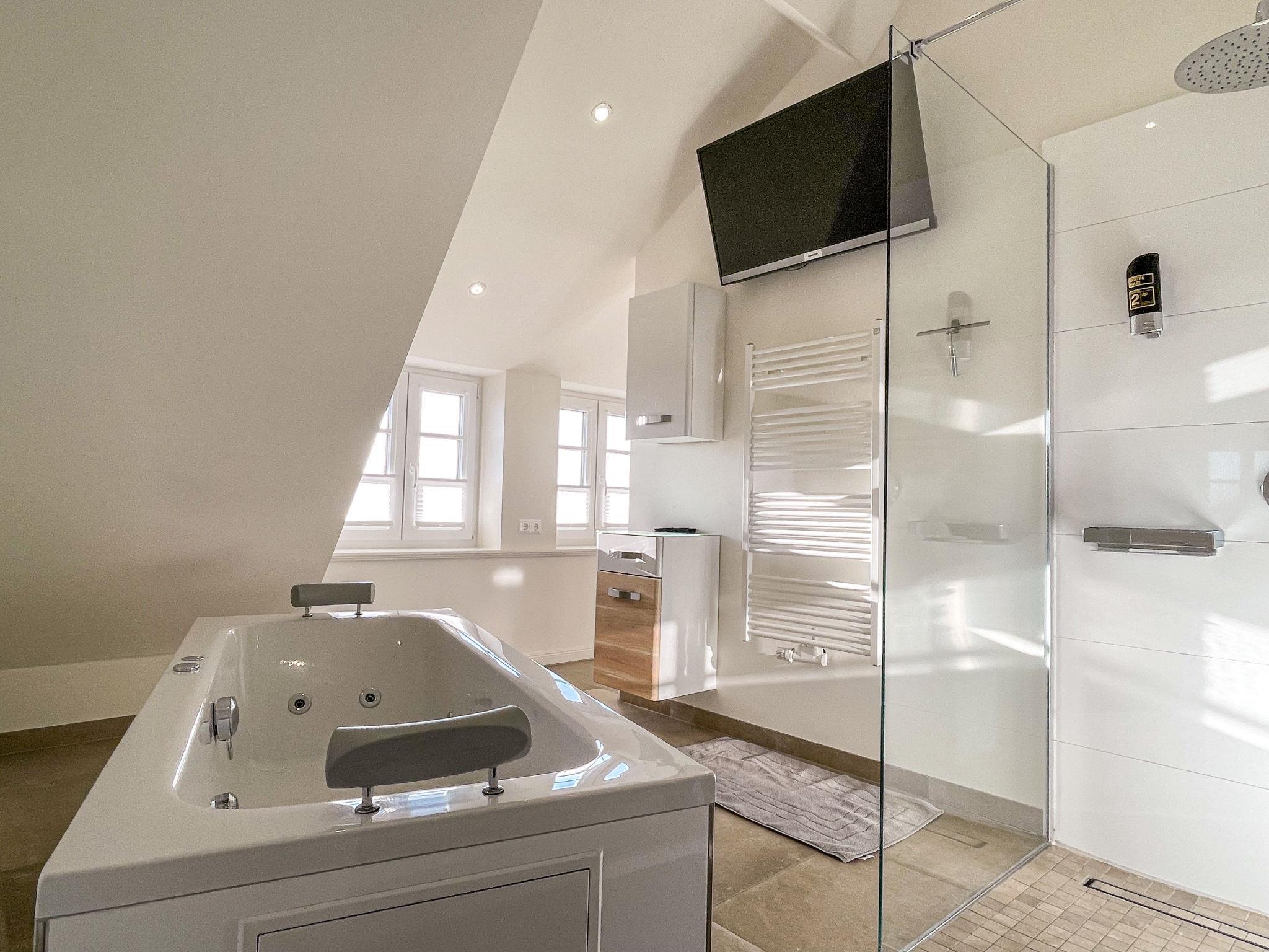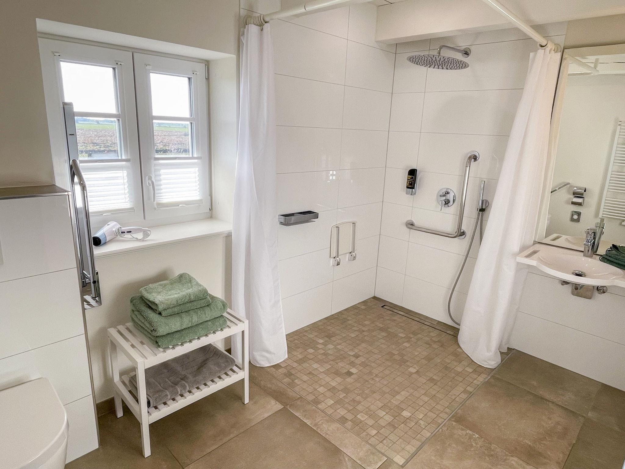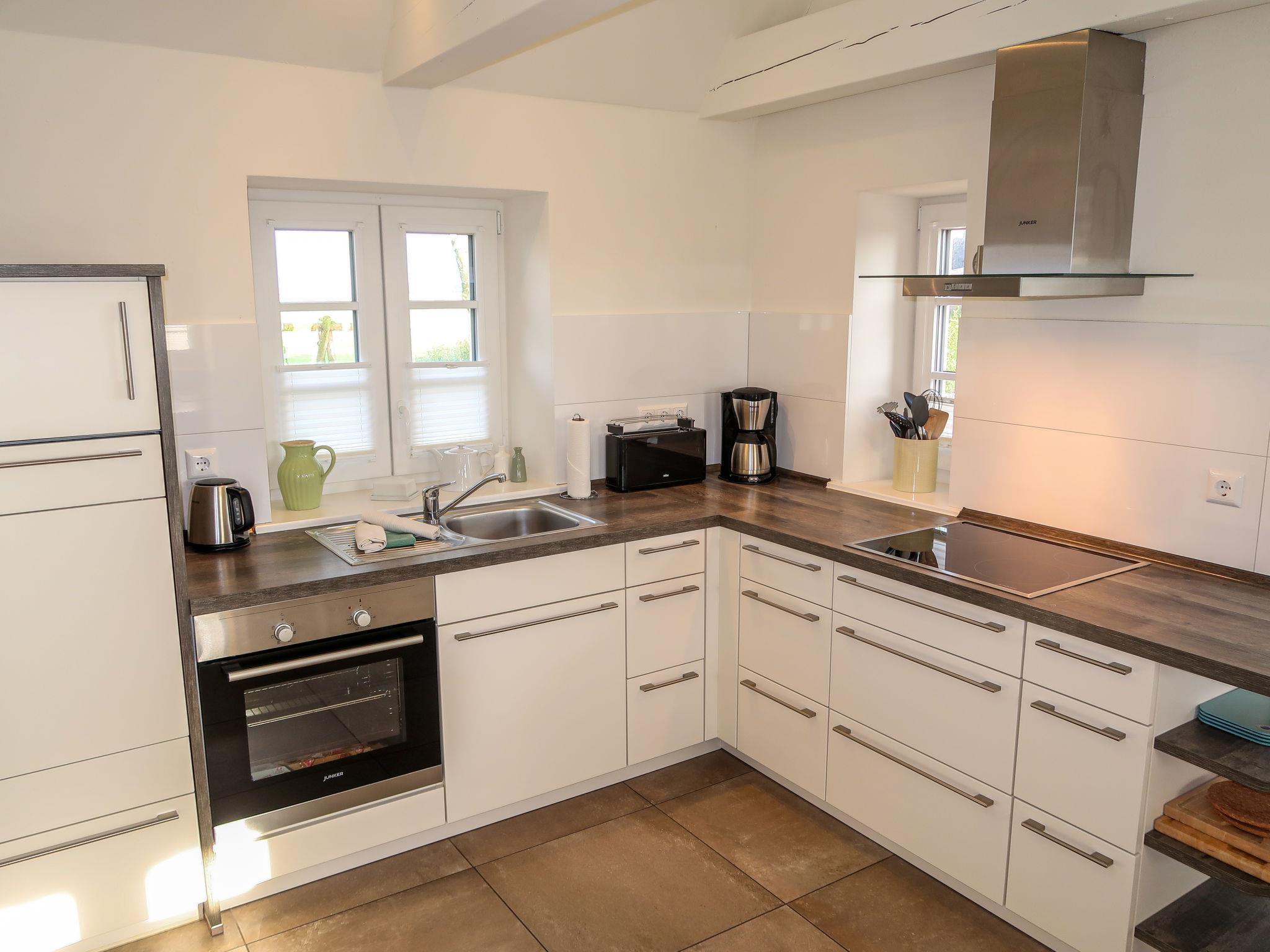 "Steuerbord", 3-room semi-detached house 115 m2 on 2 levels. Modern and tasteful furnishings: living/dining room with dining table and satellite TV (flat screen). 1 double bedroom with 1 double bed (180 cm, length 200 cm), satellite TV (flat screen). Exit to the garden, to the terrace. Large, open kitchen (oven, dishwasher, 4 ceramic glass hob hotplates, toaster, kettle, electric coffee machine). Bath/shower. Gas heating. Upper floor: 1 double bedroom with 1 double bed (180 cm, length 200 cm). Bath/shower/WC, hydro massage bath. Large garden 400 m2. Terrace furniture, deck chairs, box-room. Beautiful view of the countryside. Facilities: washing machine, dryer, children's high chair, baby cot. Internet (WiFi, free). Please note: non-smokers only. Maximum 2 pets/ dogs allowed.