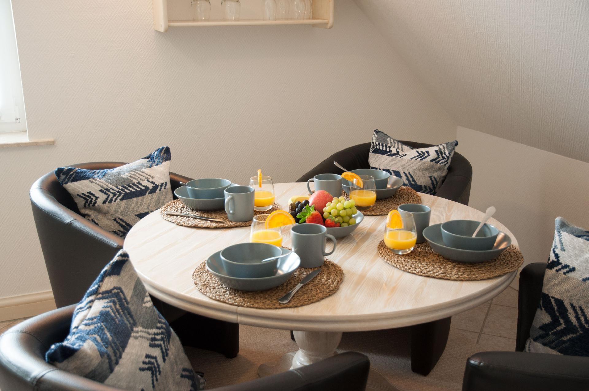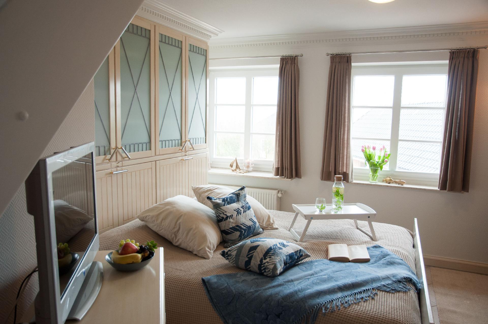 The house offers modern, charmingly furnished apartments. The apartment “Pidder Lüng” is on the upper floor of the house and has a living room-bedroom with a kitchen unit, as well as a shower room and a bedroom in the attic. The living room provides a cosy suite with a table and four comfortable armchairs, an electronically operated double cupboard bed, cupboards and a flatscreen TV with digital satellite channels. The separate bedroom in the attic is accessed via stairs. It has two single beds and a cupboard. The shower room is fitted with a shower, WC and washbasin, as well as underfloor heating. The kitchen provides a four-ring ceramic hob, a fridge, coffee machine, toaster, kettle, crockery and cookware. A telephone (payable), a Wi-Fi hotspot and a wash centre with a washing machine and dryer are available. Wi-Fi is available on request. A children’s bed and a highchair are available free of charge.