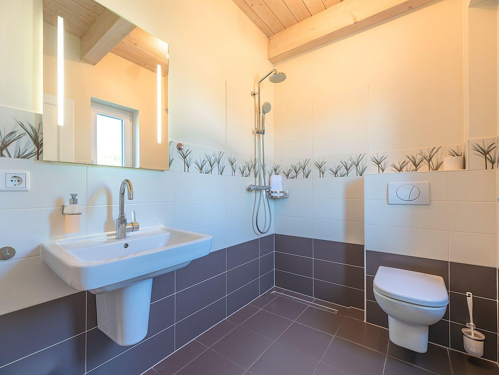 Der offene Wohnbereich mit gemütlicher Sofaecke, Kaminofen und voll ausgestatteter Küche bildet das Herz des Hauses. Im Erdgeschoss befinden sich ein Schlafzimmer mit breitem Einzelbett sowie ein barrierearmes Bad mit schwellenloser Dusche ? ideal für Gäste, die auf Treppen verzichten möchten.