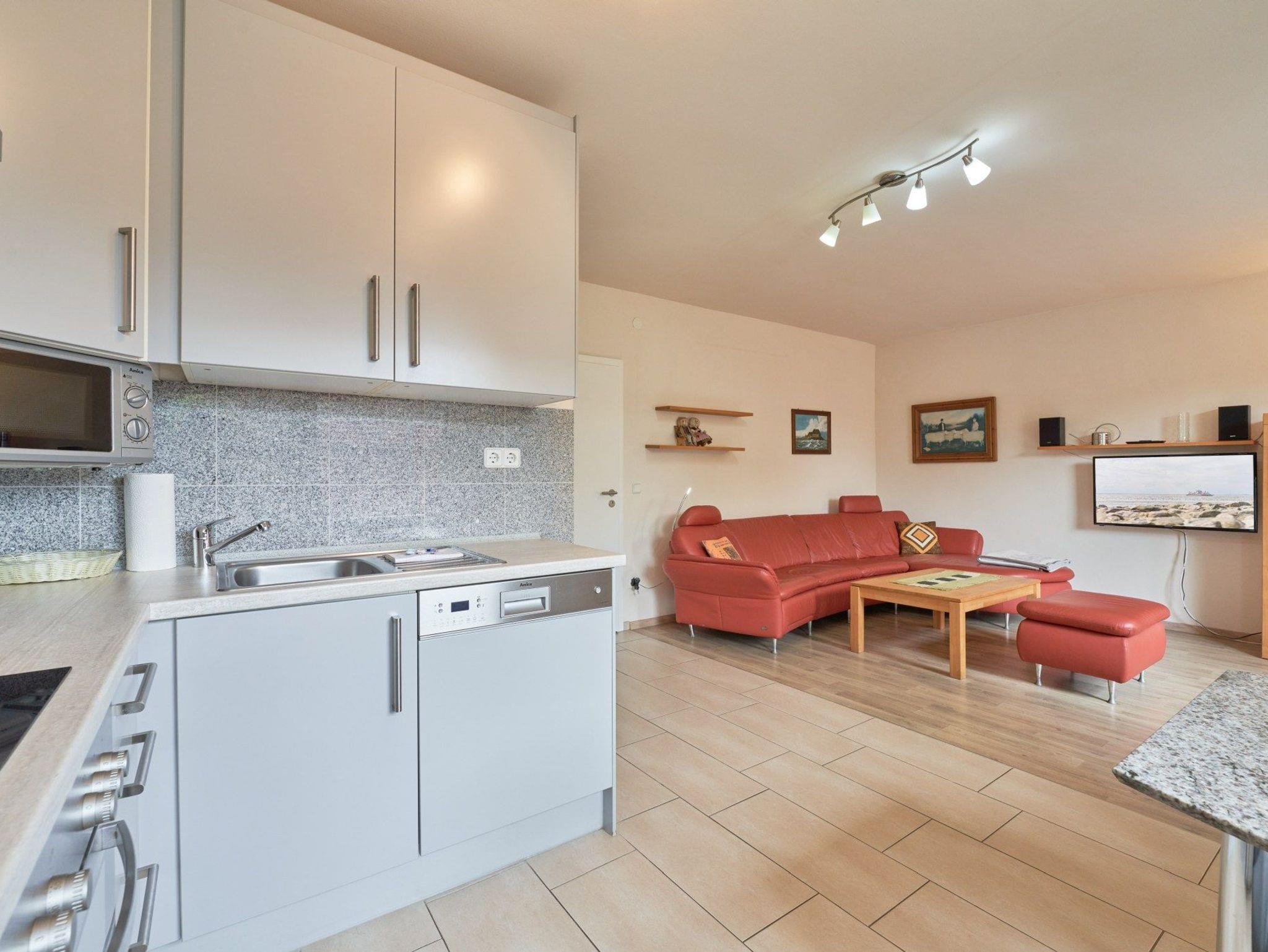 Die offene Einbauküche ist komplett ausgestattet mit einem Herd inkl. Backofen und Cerankochfeld, Geschirrspüler, Kühlschrank mit Gefrierfach, Kaffeemaschine, Toaster, Mikrowelle und Wasserkocher.