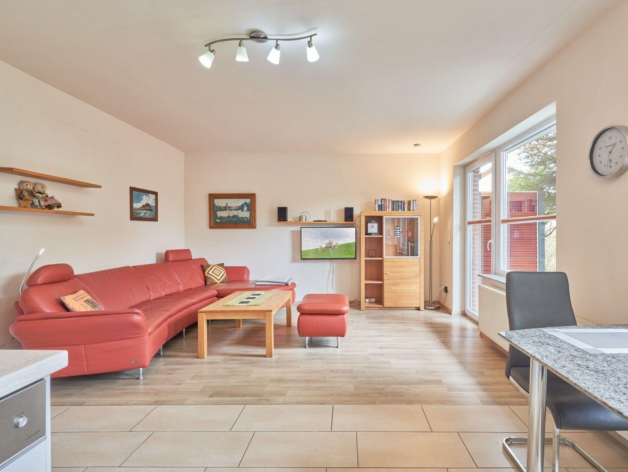 Die 2-Zimmer-Ferienwohnung verfügt über ein Wohnzimmer mit einem großen Ledersofa, außerdem gibt es einen 40 SAT-TV sowie einen WLAN-Internetanschluss.