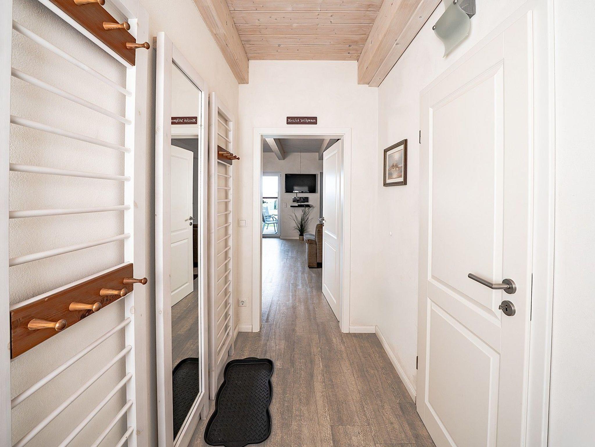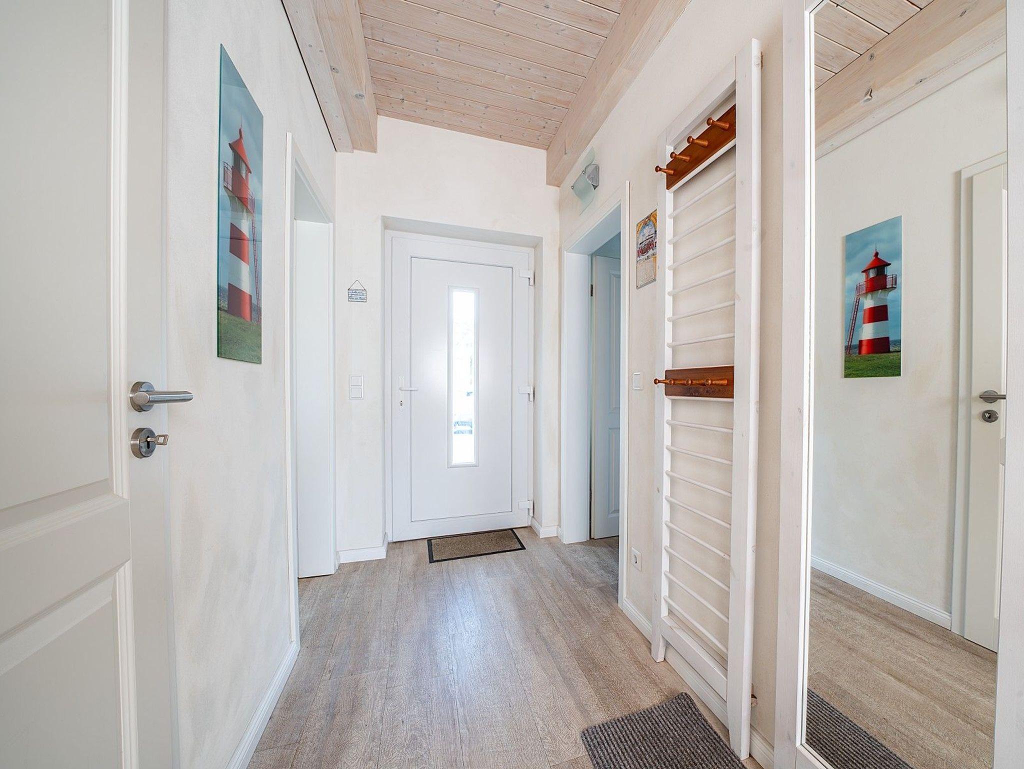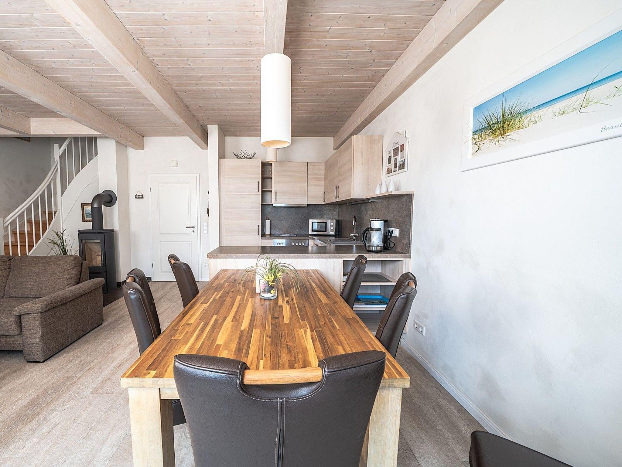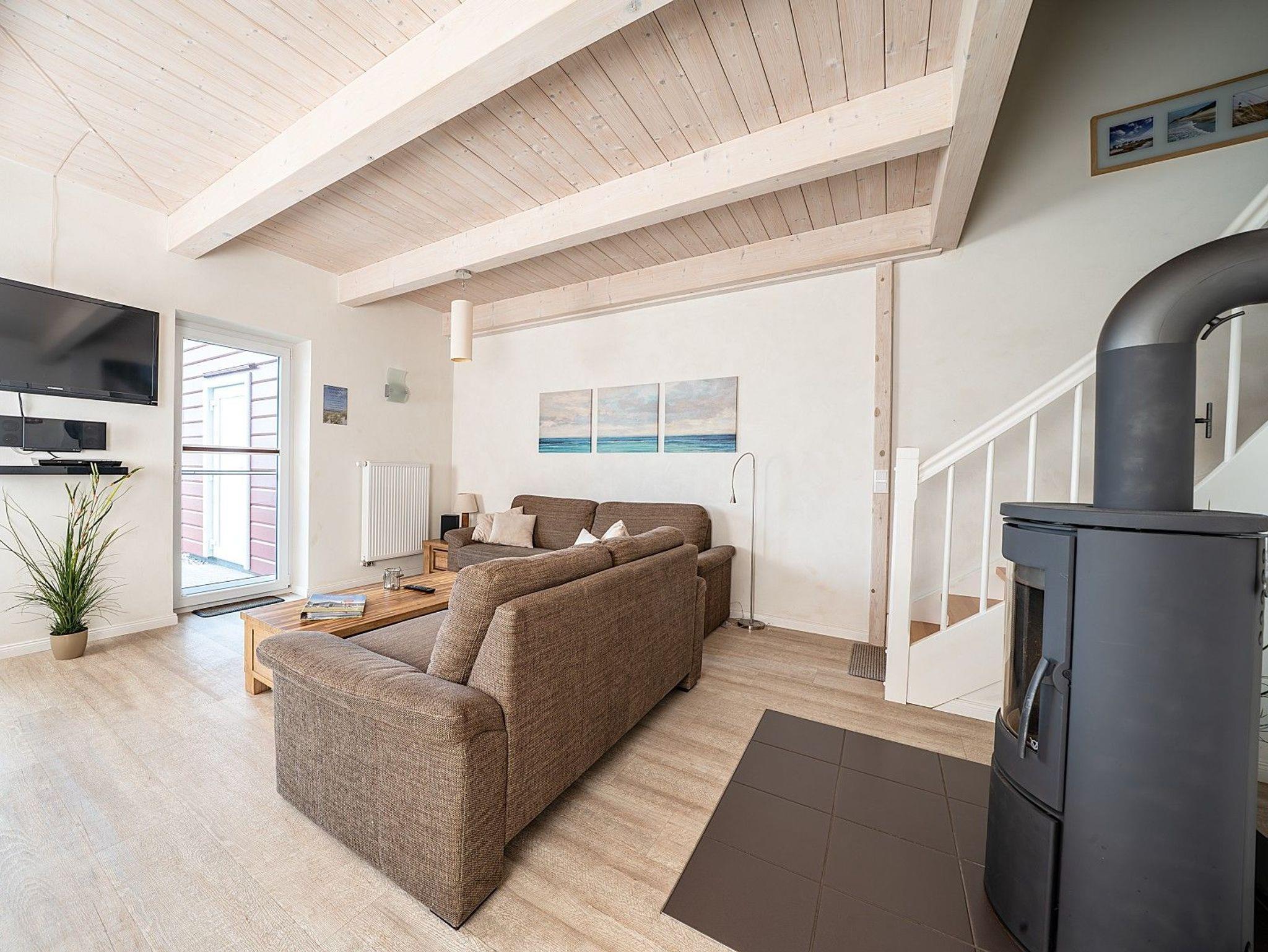 Das hochwertig ausgestattete Ferienhaus in Dagebüll bietet auf 101 m² Wohnfläche Platz für bis zu fünf Personen und liegt nur wenige Schritte vom immergrünen Nordseestrand entfernt. Der helle Wohnbereich mit moderner Küche, gemütlicher Sofaecke und Kaminofen schafft eine einladende Atmosphäre. Für Unterhaltung stehen Blu-Ray-Player, DVD-Player und zwei Fernseher zur Verfügung. Im Obergeschoss befindet sich der Wellnessbereich mit großzügiger Sauna und einer XXL-Badewanne für zwei Personen.