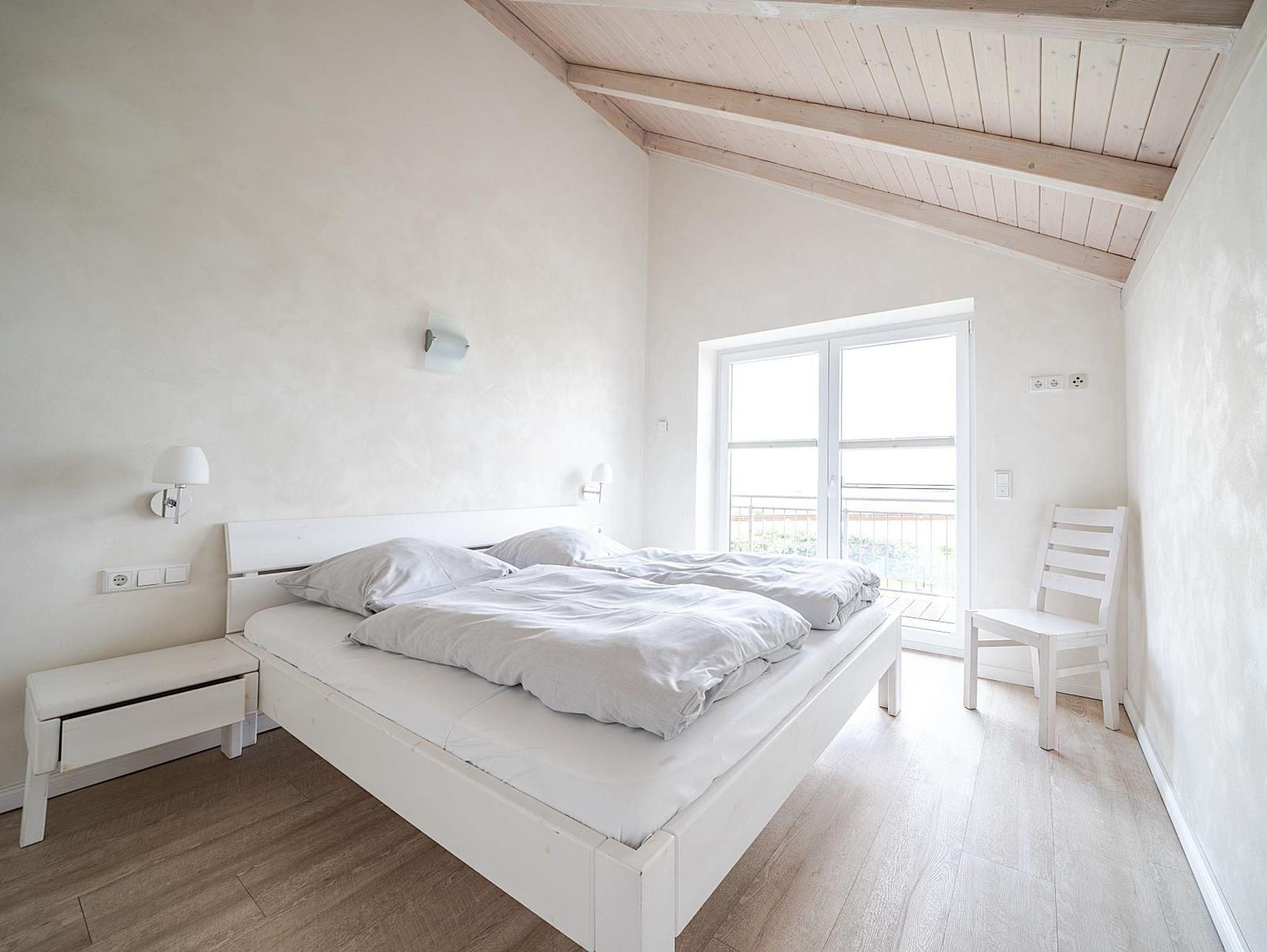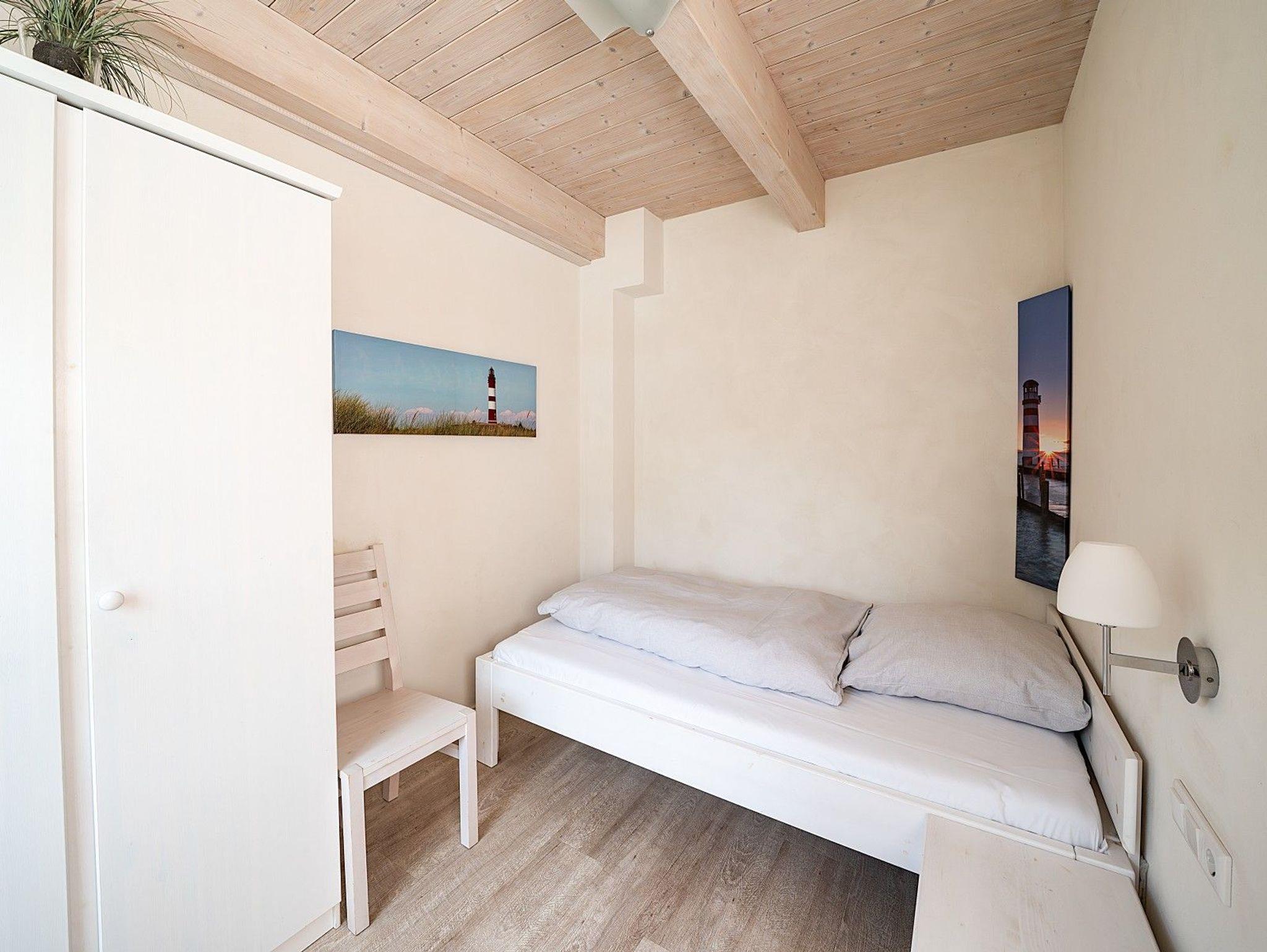 Im Erdgeschoss sorgt ein barrierearmes Bad mit ebenerdiger Dusche für zusätzlichen Komfort. Dort liegt auch ein Einzelzimmer mit 1,20 m breitem Bett, das sich besonders für Gäste eignet, die Treppen vermeiden möchten. Zwei weitere Schlafzimmer mit Doppelbetten befinden sich im Obergeschoss. In der Hauptsaison sind fast alle Fenster mit Fliegengittern ausgestattet.