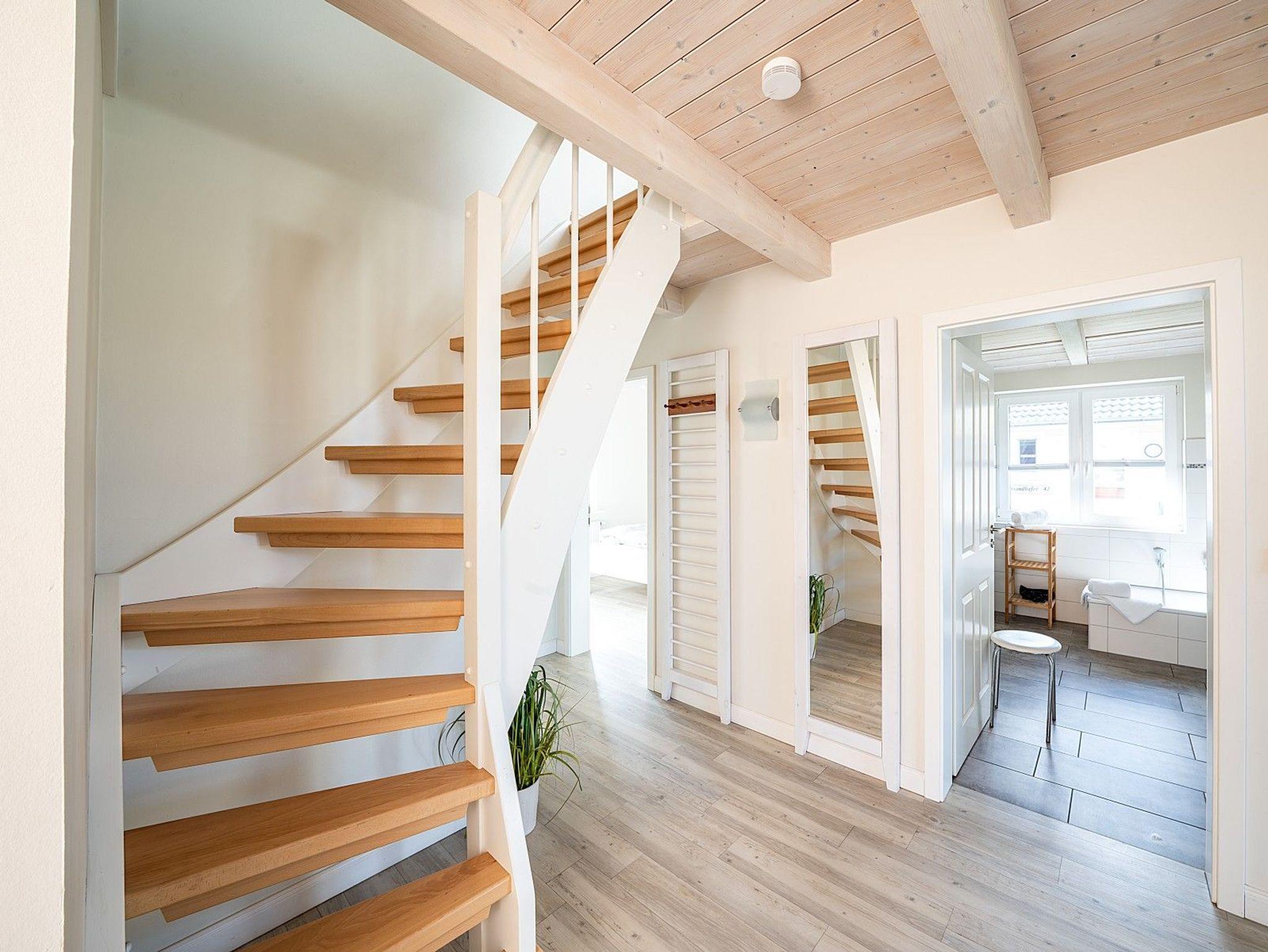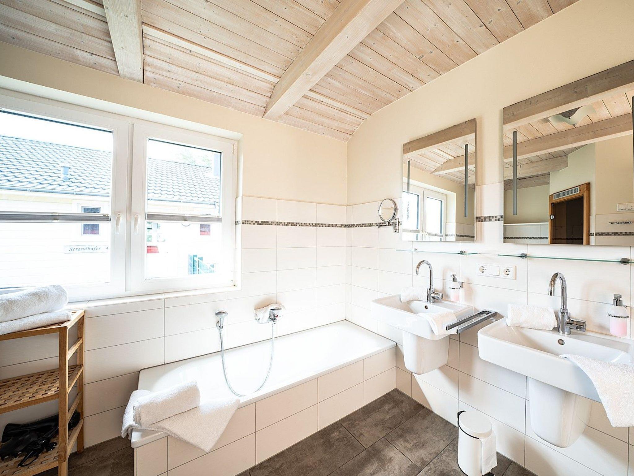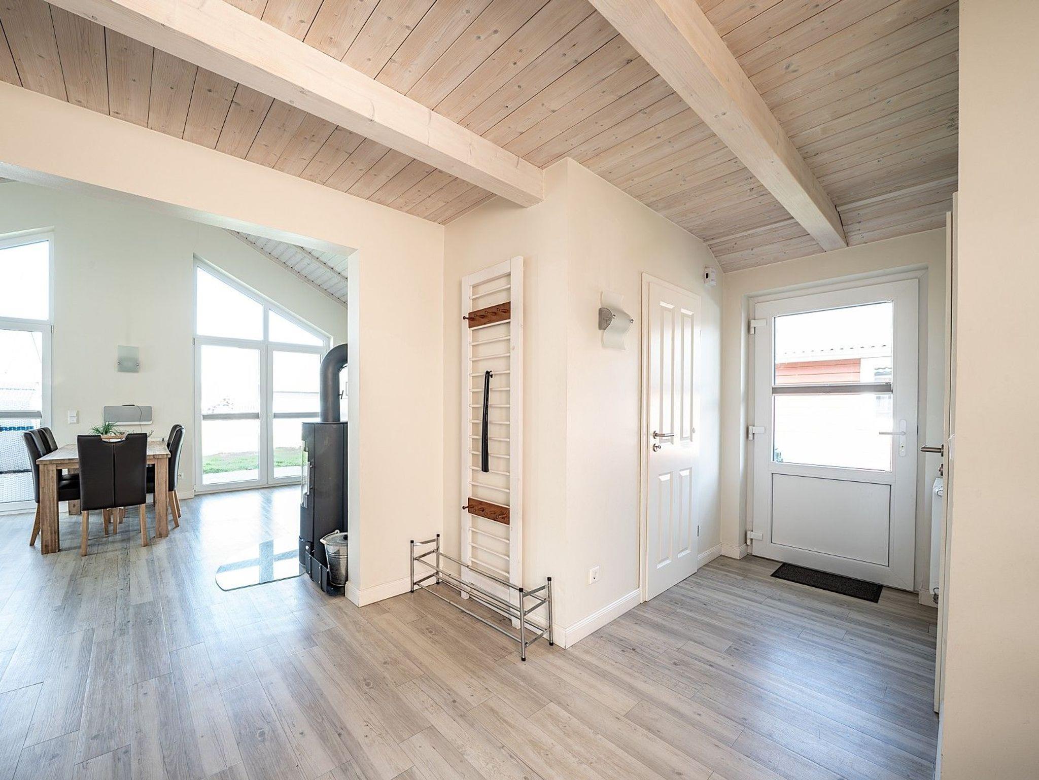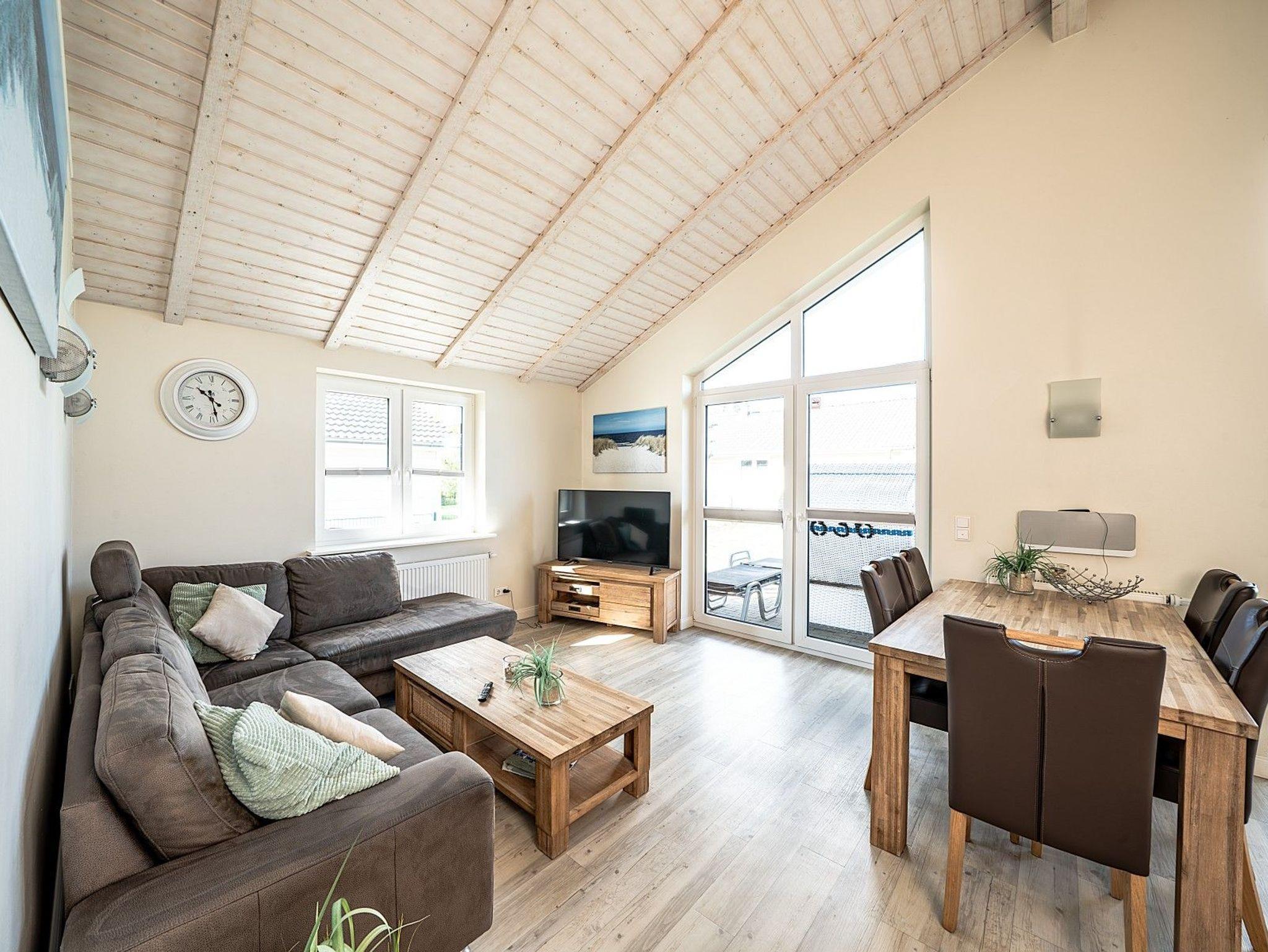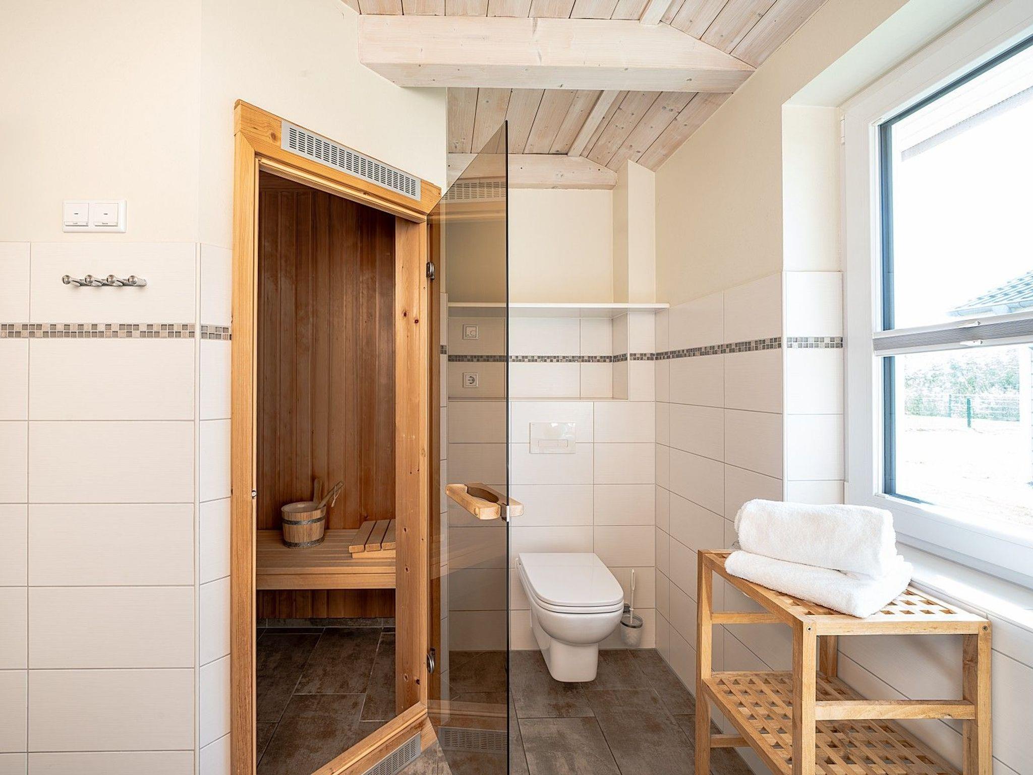 Zwei liebevoll eingerichtete Schlafzimmer mit Doppelbetten, ein modernes Bad mit Dusche und Badewanne sowie ein heller Wohnbereich mit Kaminofen schaffen eine warme, einladende Atmosphäre. Die voll ausgestattete Küche lässt keine Wünsche offen, und in der privaten Sauna genießen Sie Entspannung nach einem Tag am Meer.